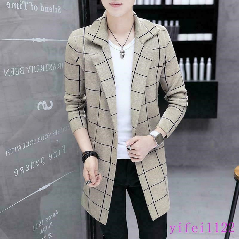Mens Kint Cardigan Sweater Checks Korean Long Slim Lapel Outwears Coats Jackets