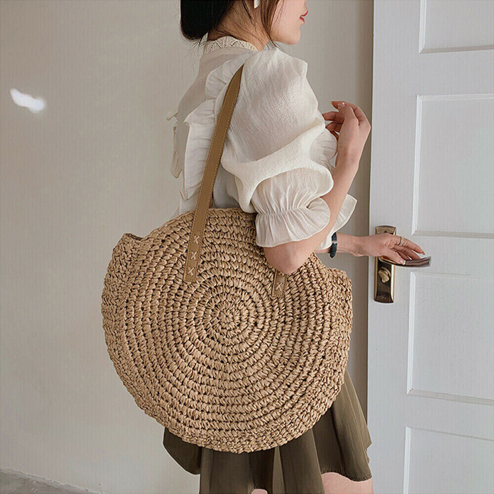 Women Boho Woven Handbag Summer Beach Tote Straw Bag Round Rattan Shoulder Bag