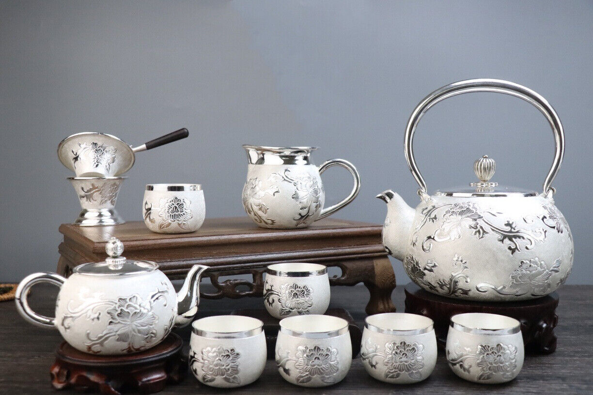 Sterling Silver Tea Set Stove Kettle Tea Pot Tea Cups 100% 999 Silver Snowflake