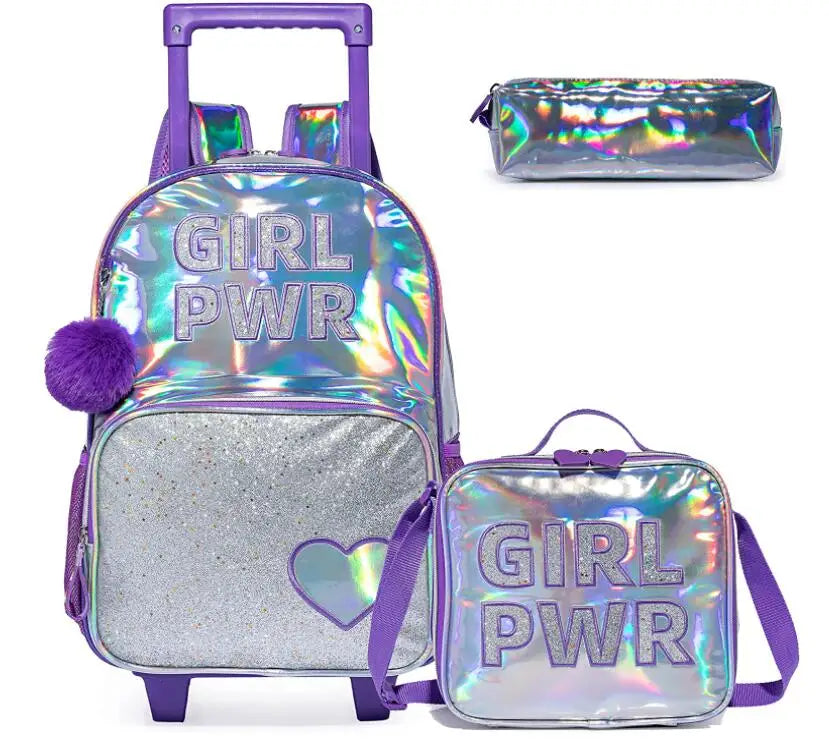 Kids Trolley Backpack and Lunch Bag Set for Girls Sequin Rolling Backpack for Girls Backpack with Wheels Kids Hand Luggage Bag