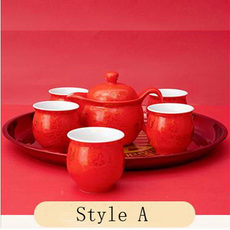 Dragon and Phoenix Double Happiness Ceramic Tea Set, Teaware, Tea Infuser, Pot Cup, Porcelain Red, Wedding Gift, 7 Pcs