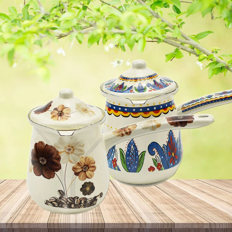 700ml Enamel Small Milk Pot Long Handle Butter Melting Bucket English Coffee Milk Cup Mini Brew Coffee Bucket Milk Heating Pot
