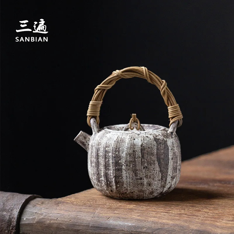 Three Times|Japanese-Style Pink Hand-Made Rattan Loop-Handled Teapot Japanese Retro Kung Fu Tea Teaware Tea Brewing Pot Humani