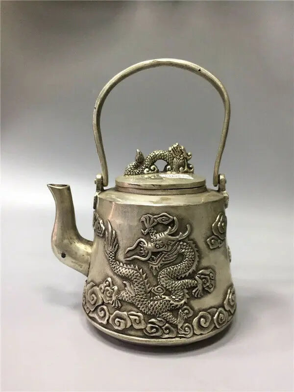Chinese Tibet Silver Copper Handwork Carved Dragon Teapot W Daming Xuande Mark