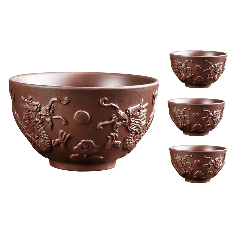 Yixing Zisha Double Dragon Tea Bowl, Large Handmade Relief, Phoenix Tea Cup, Master Cup, Tea Accessories, 3Pcs