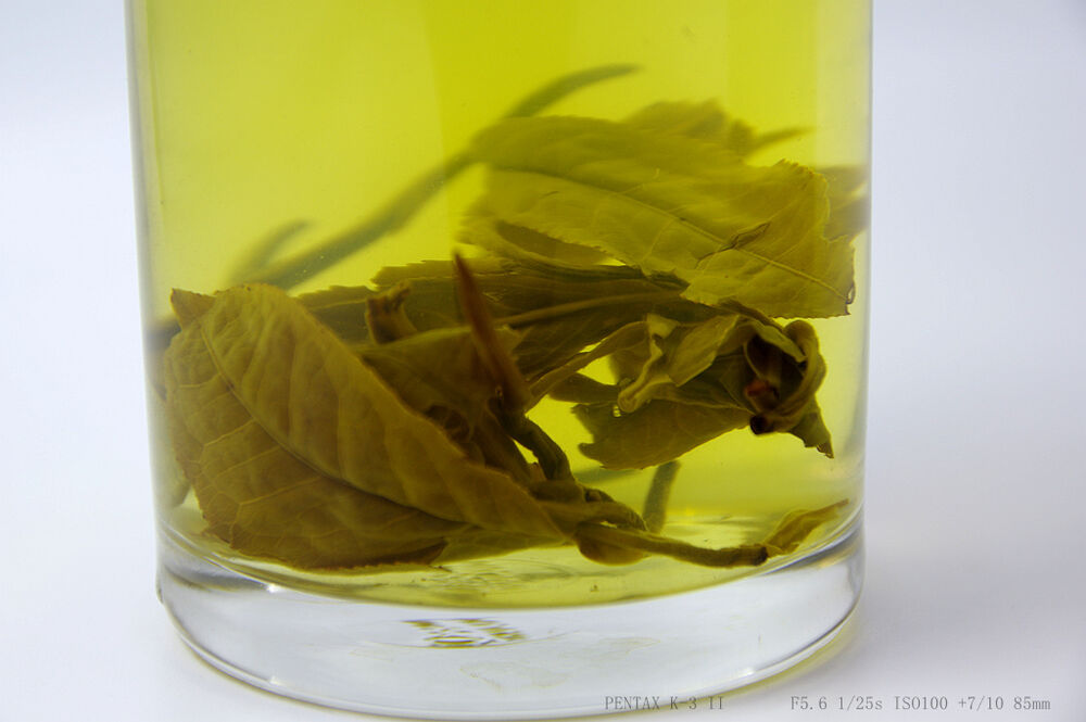 When steeped, these leaves unroll and produce a tea with a pronounced floral and fresh green tea scent, a full-bodied refreshing sweet taste, and a pleasing long lasting floral aftertaste. The hue of this tea is a light peach color.