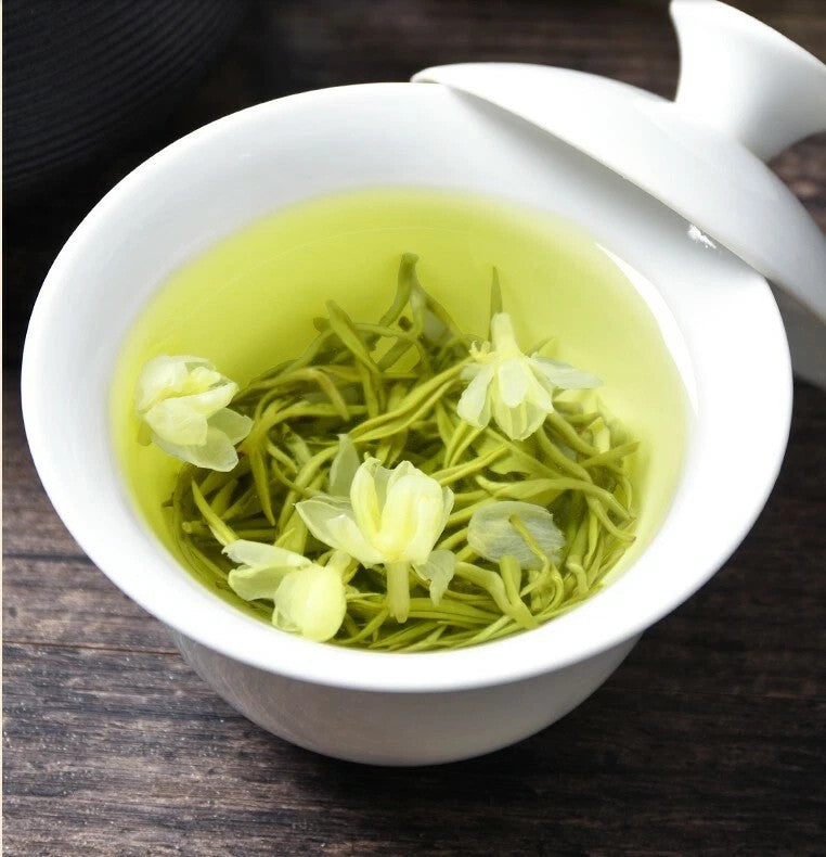 Jasmine Mao Feng green tea comes from the high mountains in China, a beautiful region well known for its green tea. The buds and young leaves are harvested by hand in the spring. The unbroken buds and unfolded leaves are processed for this tea, and then scented with Jasmine petals to produce a fragrant Jasmine aroma and a crisp, refreshing aftertaste