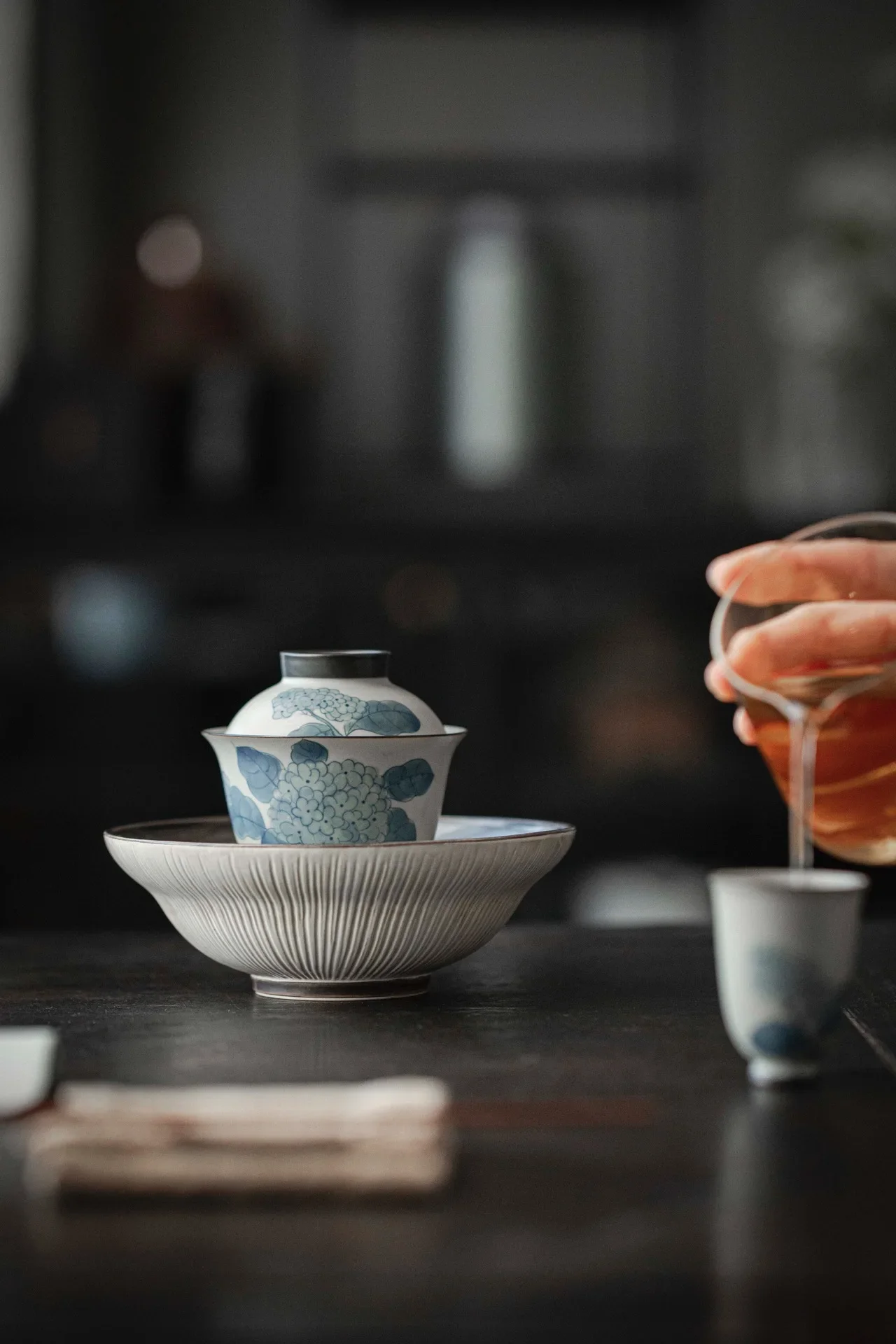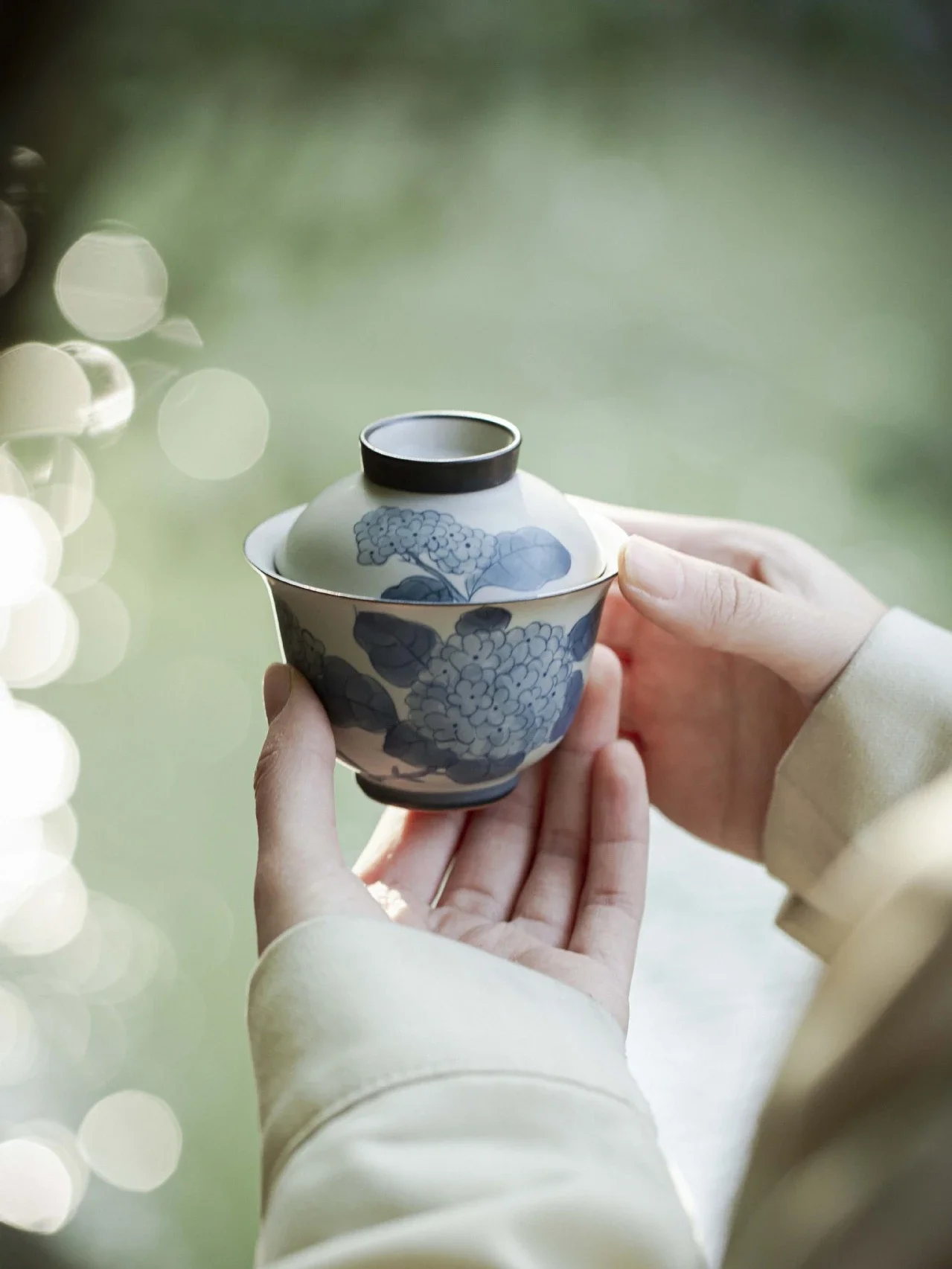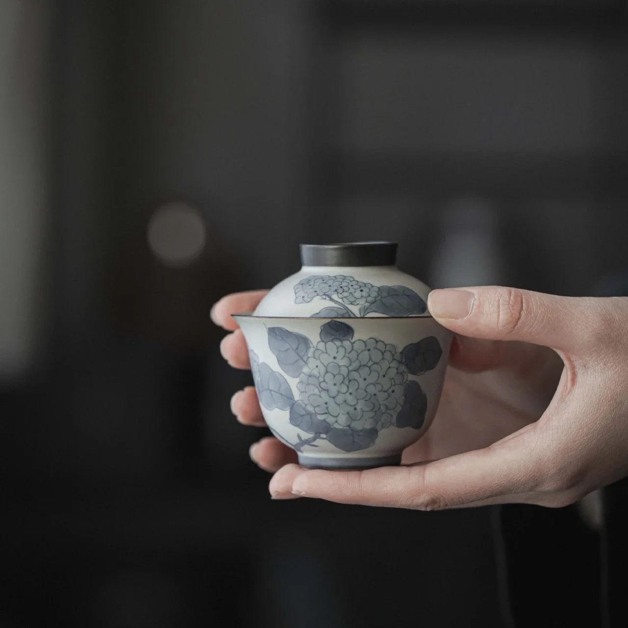 110ml Antique Hand-painted Hydrangea Ceramic Tea Tureen Literati Tea Maker Cover Bowl with Lid Chinese Gaiwan Kung Fu Tea Set