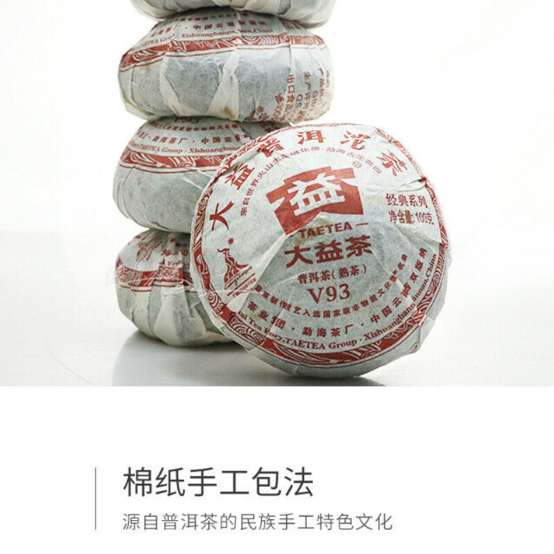 V93 ripe Pu Er tea was first released in 2005, a high classic, quality ripe Pu Er tea. Why it is called V93? Because it inherits the special recipe of high quality Menghai Pu Er tea produced in 1993; V is the code summary for the V93, V2, V4 series of Pu Er tea, whose recipes are the combination of past classic Maocha techniques, quality characters, taste and aroma with the new processing and invention.