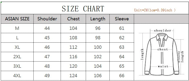 Note: We sell ASIAN SIZE is about 2-3 size SMALLER than US,UK,AU,EU size.Please choose the size according to our size form.All the dimensions we have personally measured and reality try. When you place the order please live the message with your Shoulder(CM) and Chest(CM) .We will help you to confirm the size.Think you for buying !