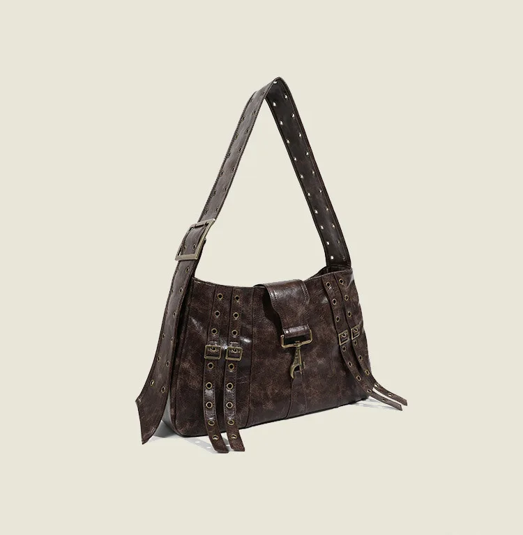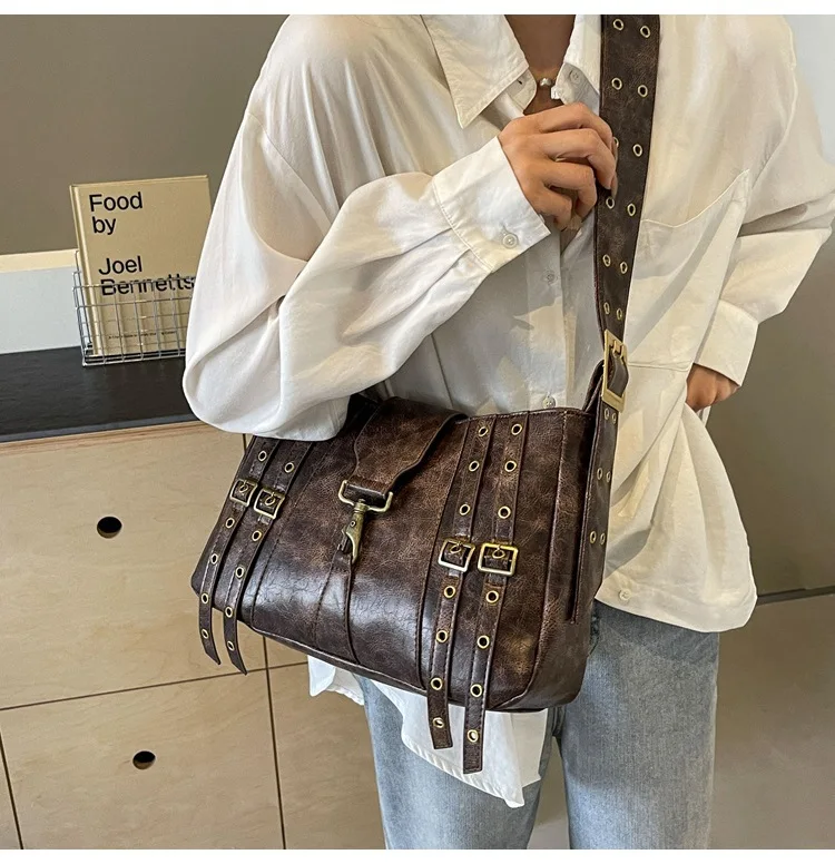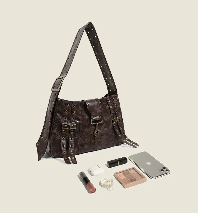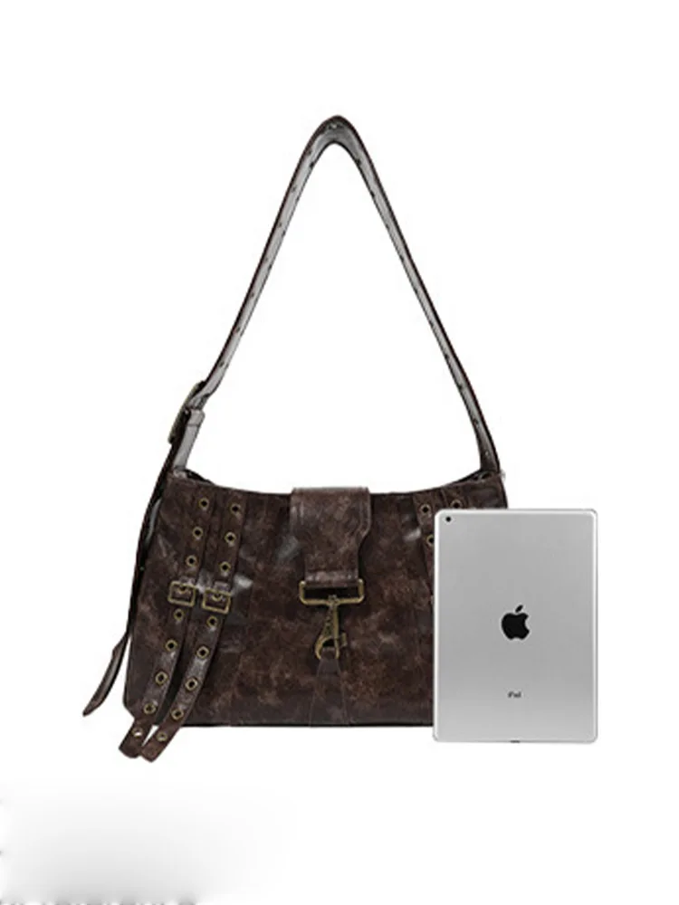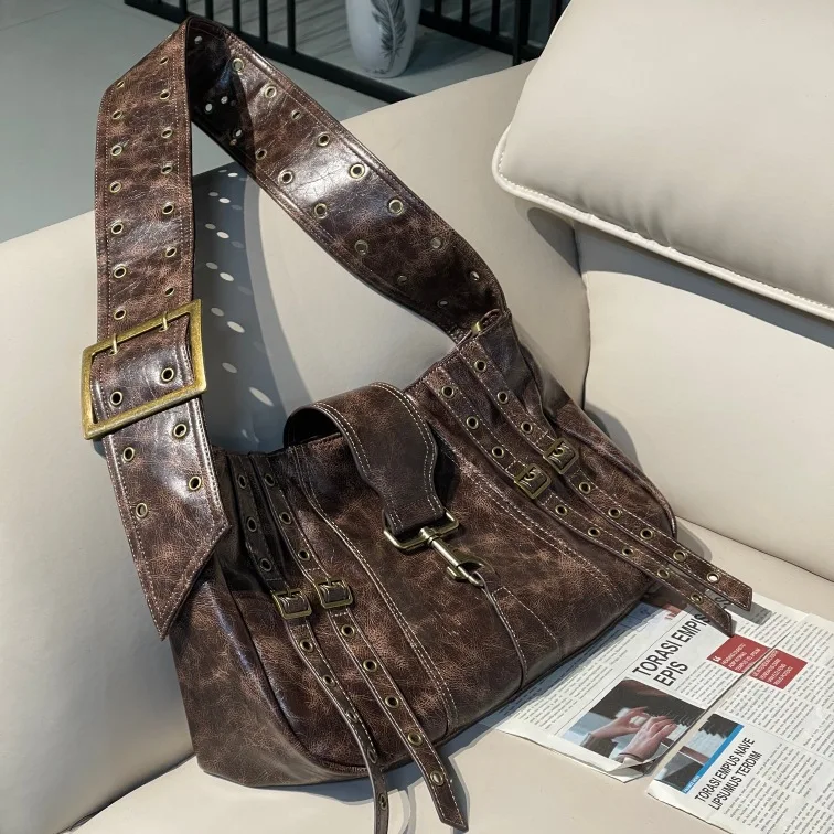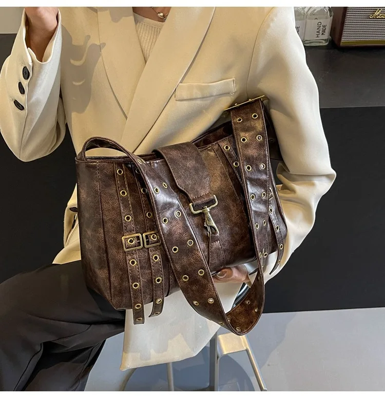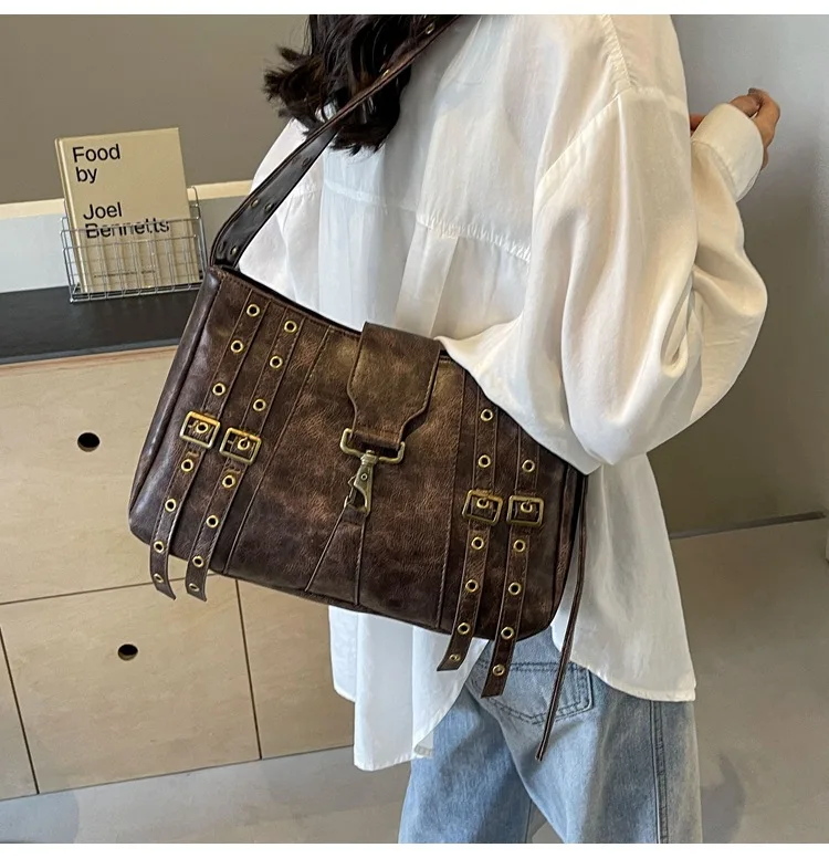 2024 summer popular women's shoulder bag large capacity casual genuine leather retro handbag punk high-end luxury women's bag