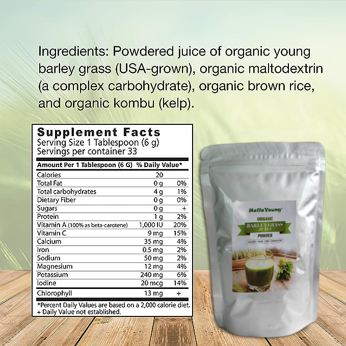 Barley grass has long been known for its health advantages, with ancient people using it to cure blood, intestinal, liver, and skin illnesses. Forexample, ancient Greeks utilized mucilage generated from barley cerealto treat digestive problems, whilefamous gladiators ate it to increase their stamina and strength.Roman physicians alsoused it to heal boils. The benefits of barley grass powder are often attributed to its high nutritive content. According to the US Food and Drug Administration, 3 teaspoons or 5 grams of the powder contains the following nutrients: ⨀ Protein – 5 grams ⨀ Vitamin A – 950 IU (20% RDA) ⨀ Riboflavin – 0.12 mg (7% RDA) ⨀ Iron – 1.05 mg (6% RDA) ⨀ Magnesium – 25 mg (6% RDA) ⨀ Potassium – 168 mg (4% RDA) ⨀ Sodium – 60 mg (3% RDA) ⨀ Calcium – 26.7 mg (2% RDA) Barley grass juice powder also contains: ⨀ Beta-carotene ⨀ Vitamins B1, B2, B6, and B12 ⨀ Folic Acid ⨀ Pantothenic Acid HelloYoung Organic Barley Grass Powder is pure and free of additives, artificial colors, and fillers. Experts continue to uncover the many barley grass benefits for the body since more and more people join the barley grass juice powder craze: ▶ Fights Free Radical Damage, Inflammation, and Liver Disease ▶ Helps Prevent Cancer ▶ Lowers Cholesterol, Blood Pressure, and the Risk of Heart Disease ▶ Improves Insulin Sensitivity ▶ Promotes Better Digestion – and Immunity ▶ Reduces Depressive Symptoms – and Improves Cognition ▶ Facilitates Sleep ▶ Promotes Skin Health ▶ Hastens Hair Growth Packed in a food grade PE/Aluminum stand up zip pouch to better preserve the quality of the Barley Grass powder.