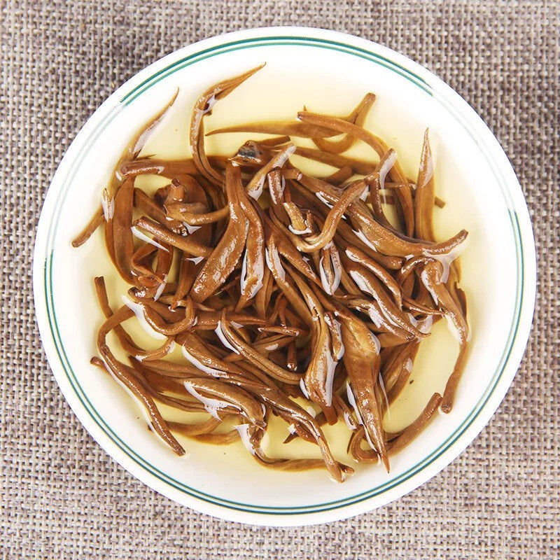 Dian Hong Jin Luo Golden Snail is an excellent medium strength and balanced black tea that comes form Ning’er County in Yunnan Province of China. Dian Hong, literally Yunnan Red, refers to the origin and type of tea). Jin Luo, literally Golden Snail, refers to the style of this tea and the way it is shaped into small coils, similarly to the famous Bi Luo Chun green tea.