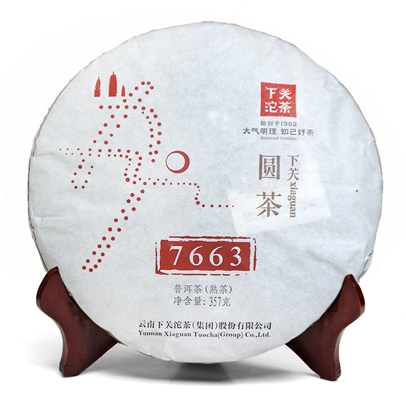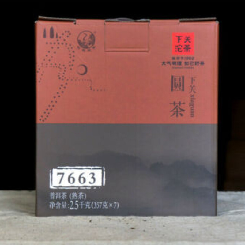 Type: Pu-erh Tea Manufacturer: Xiaguan Tea Factory Net Weight: 357g Product date: 2015 Process: Cooked / Ripe Origin: China Description: 7663 prescription started from 1975, it is a classic ripe from Xiaguan.