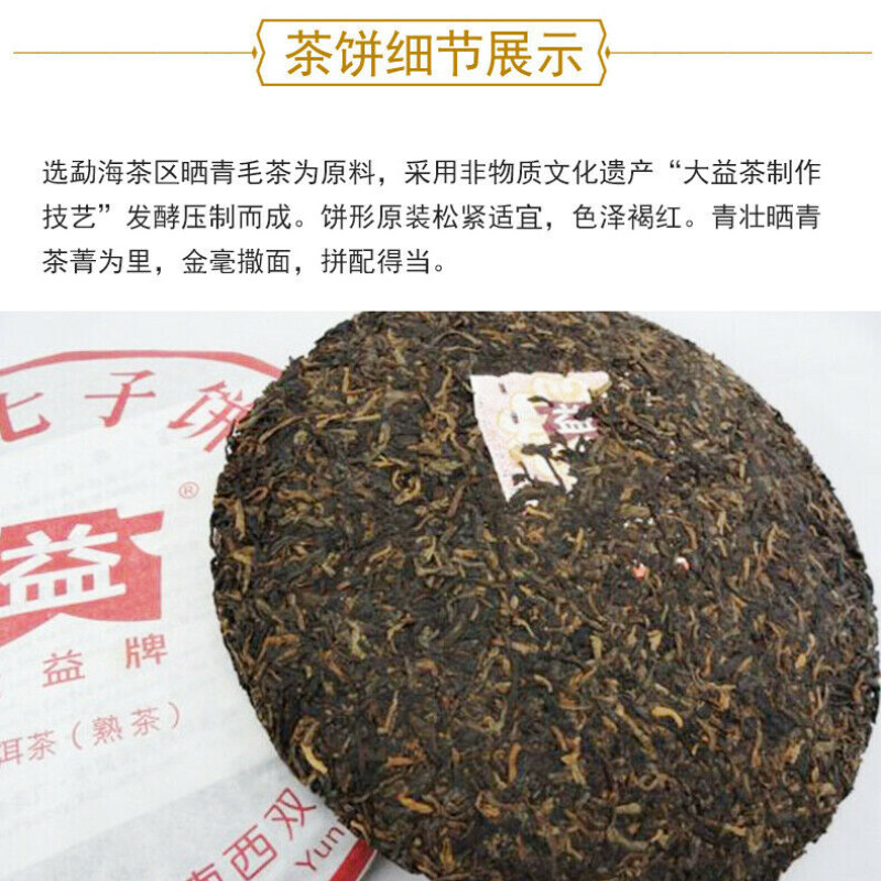 Menghai 7572 ripe Pu Er tea is one of the conventional ripe tea products in Menghai factory, and regarded as the standard ripe Pu Er tea for tea drinkers or tasters to judge the quality of other ripe Pu Er tea. Golden tip buds are spreaded on the tea cake surface with main 7 grades of Maocha inside. Medium fermentation, this allows the activity of the tea to change as time goes by. Mellow taste and long sweetness. If stores for about 5 years, its age aroma appears and tea liquid becomes more smooth and soft. Drinking the ripe Pu Er tea for a long time is good for keep weight and descreasing the blood fat, blood sugar and maintain your skin activity.