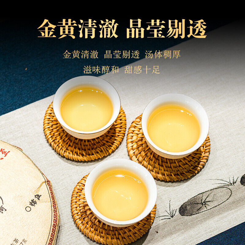饼面圆润饱满,持嫩度高,清晰显毫。汤色橙黄透亮,内含物质丰富。初闻密香浓郁,细闻带有花果清香。
