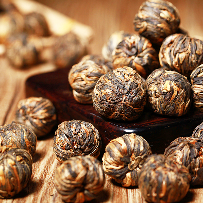 This ia a hand shaped Chinese black tea. Pearls are black tea leaves that are hand-twisted and dried into a little tea ball. When steeped in hot water, the tea ball slowly unfurls its leaves into a blossom right before your eyes in glass cup or tea pot. This tea has a bold coppery-red color, chocolate-like aroma and fine flowery, sweet flavour, with a complex and satisfying finish.