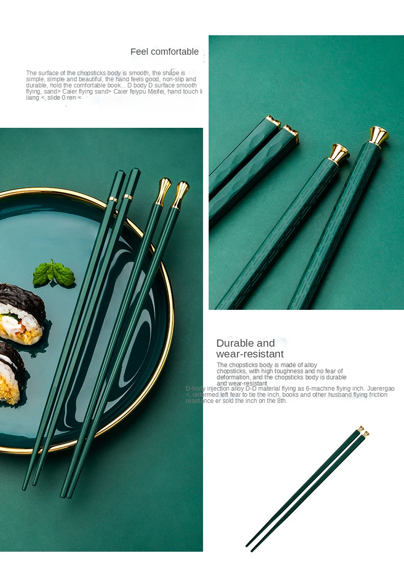 1. Non slip: These chopsticks are with anti-slip design. The reinforced non slip chopsticks tip makes the chopsticks easier to grab food and better anti-slip. The chopsticks with the textured body are easier to use and more comfortable when holding on hand. The chopsticks won't roll on the hand.