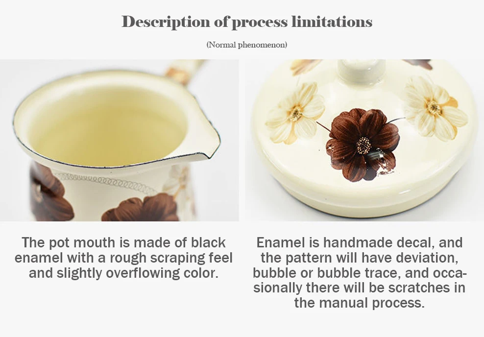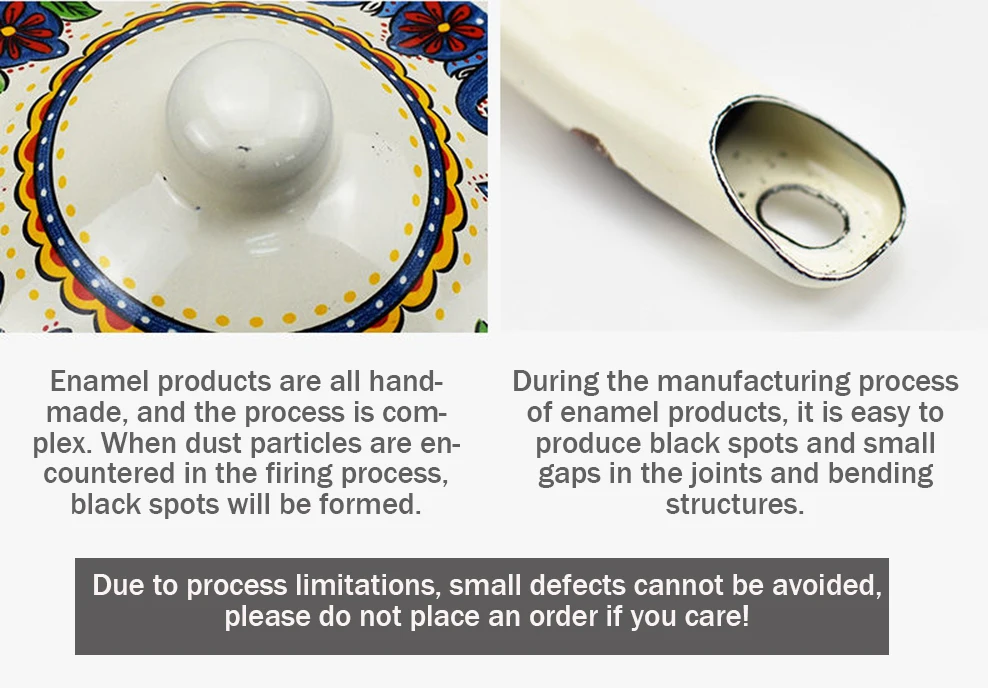 2. For enamel products, due to technical problems, it is inevitable that there will be air holes, black spots, bumps and slight porcelain dropping and other defects. Those who care, please do not place an order.