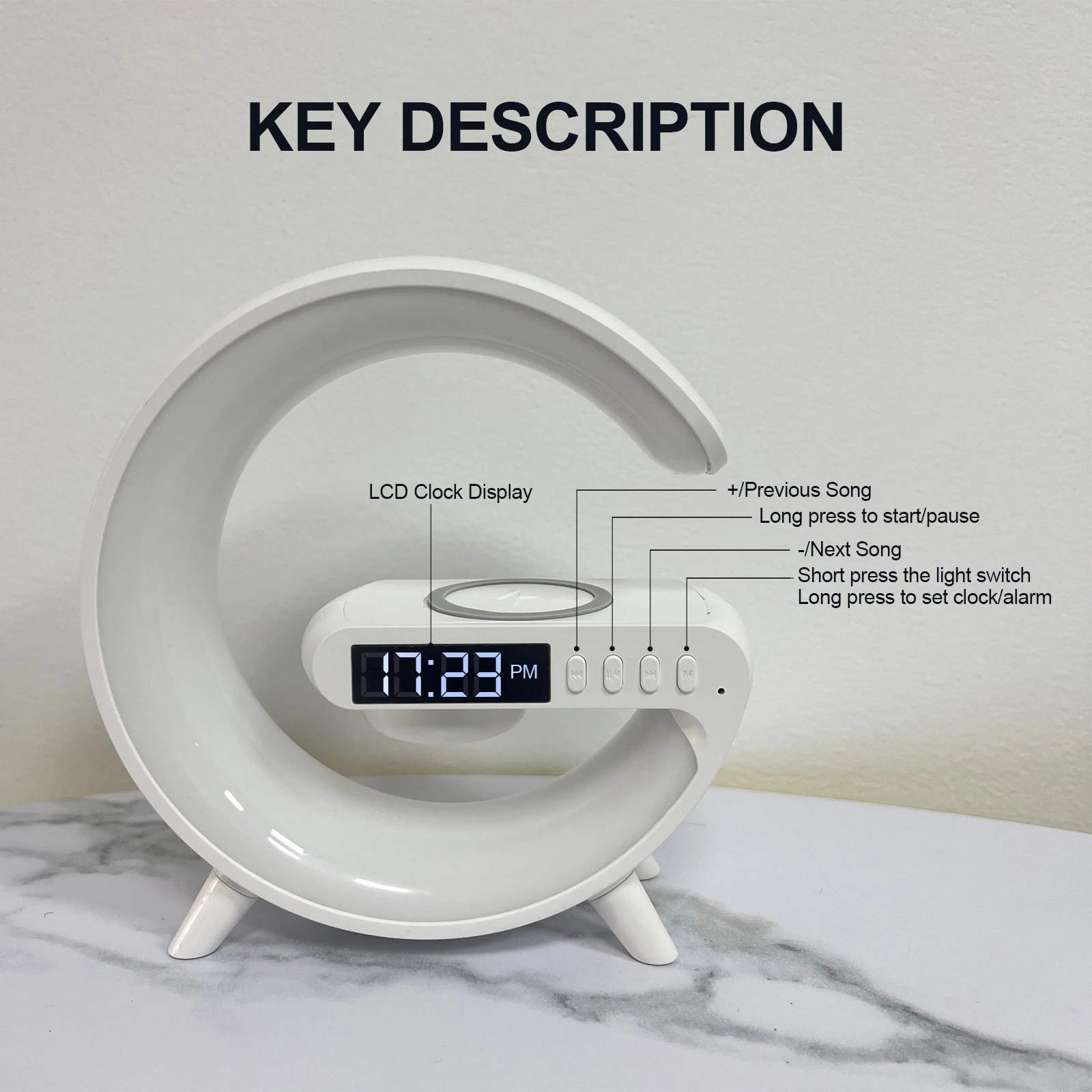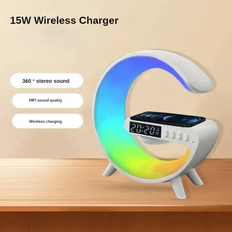 1. Short press a song Long press volume down 2. Short press pause/start Long press on/off 3Short press the previous song Long press to increase the volume 4. Short press to control the light, long press to enter the clock settings(short press to toggle the light), set the alarm in long press (short pressto switch the cursor) Technical Parameter Product model: G63 Battery type: polymer Battery:500mah Speaker resistance:40 Speaker output power: 3W Wireless charging power:10W Power input: DC5V/2A Main functions:BT.TFUSB.AUX wireless charqing colored lights Productsize:145mm*59mm*155mm Speaker size: 36mm Kev function operation instructions Power on: press and hold the power on button for two seconds tostart the machine, and the default warm light is on Bluetooth function use:this audio system supports the usc of Bluetooth devices with A2 DPfunction.First, turn it on, and press and hold the M key to enterWhen theBluetooth modeis entered theblue light of the Bluctooth indicator lightficshes, accompanied by voice prompt and the audiolt is in the state ofwalting for pairing connection.Only in this state can it be connected withBluetooth audioPair and conmect. 2. Mobile phone connection Step 1: Open the Bluetooth setting switch in the mobile phone settings.ord click Search Device Step2: When the G63 character is displayed on the available device,itmeans that the mobile phone has found the Bluetooth audio, click G63 erters the pairing mode. After the phone and audio are successfullypcired,a voice prompt will be displayed Show connected ight Use 1) G63 Bluetooth speaker is equipped with a varicty of lighting effects 2) The default light warming effect is when the device is turned on. Pressard hold the M key and then press the light key to odjust the light TF Cardiu Disk function UisetInsert the TF card/U disk into the card slot, the corresponding voiceprompt will appear and the product will automaically readThe audio filein the card is played,and the user can use the speoxer"+r_"button to control the size of the music sound. 1Scfety instructions:.Do not expose the product into the water or humid areas, suchashathrooms 2Please do not hit or drop the product hardly to avoid manual damage 3When not in use for a long time, please turn off the power.Warranty and After Sales Service:lf you have any questions during use. please feel free lo contact us, weare responsible for every customer. ![]() ![]() ![]() ![]() ![]() ![]() ![]() ![]() ![]() ![]() |