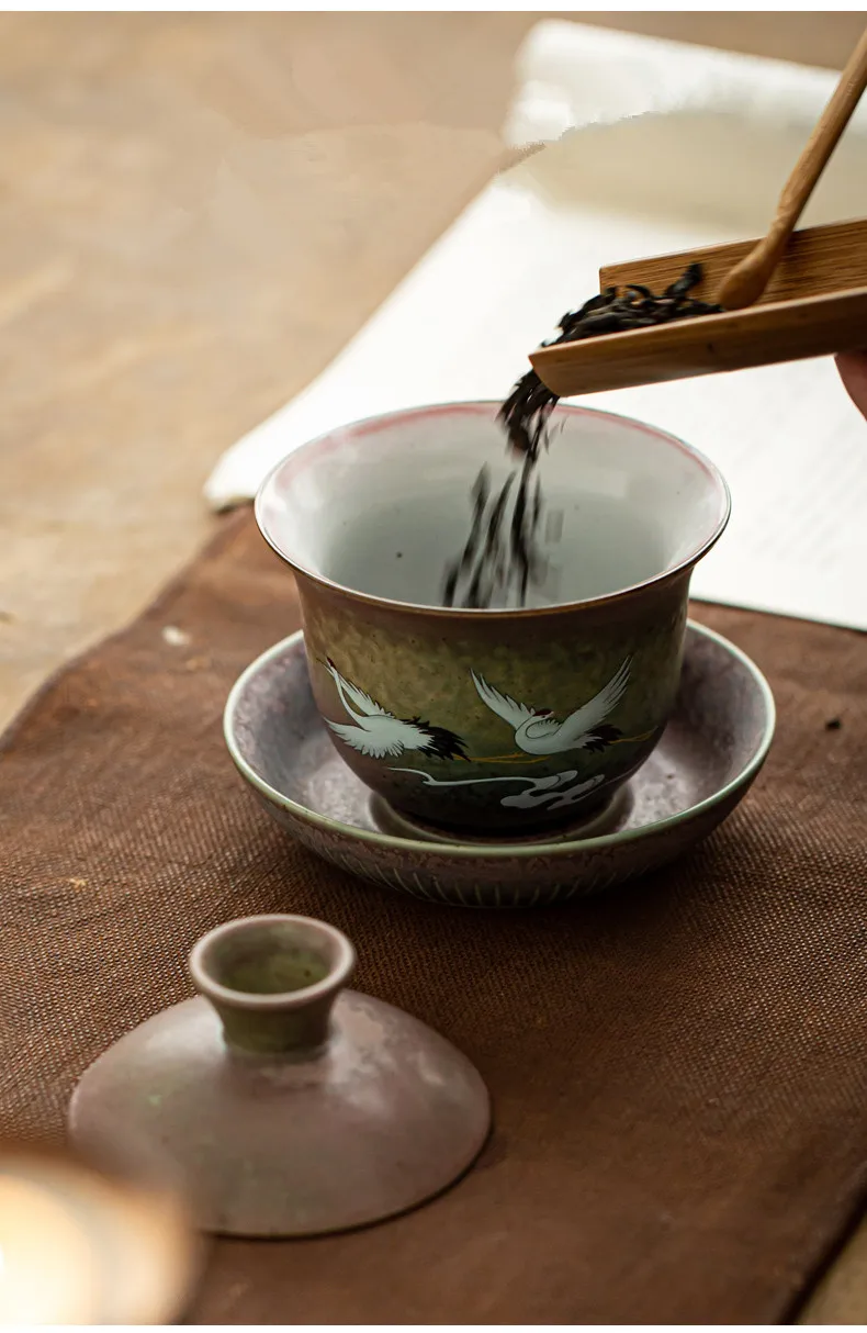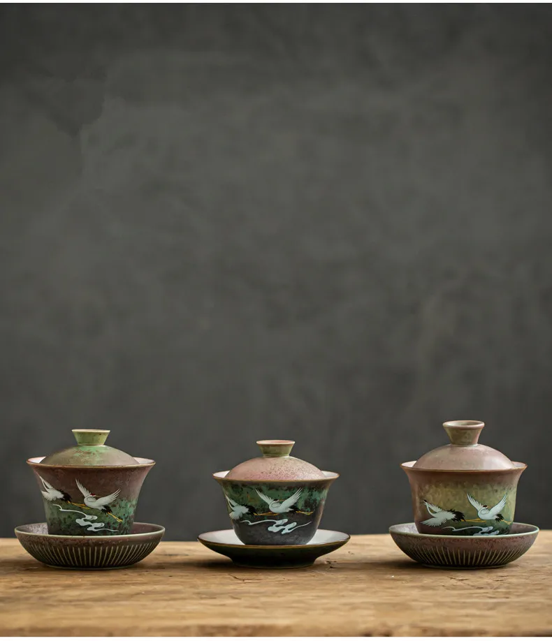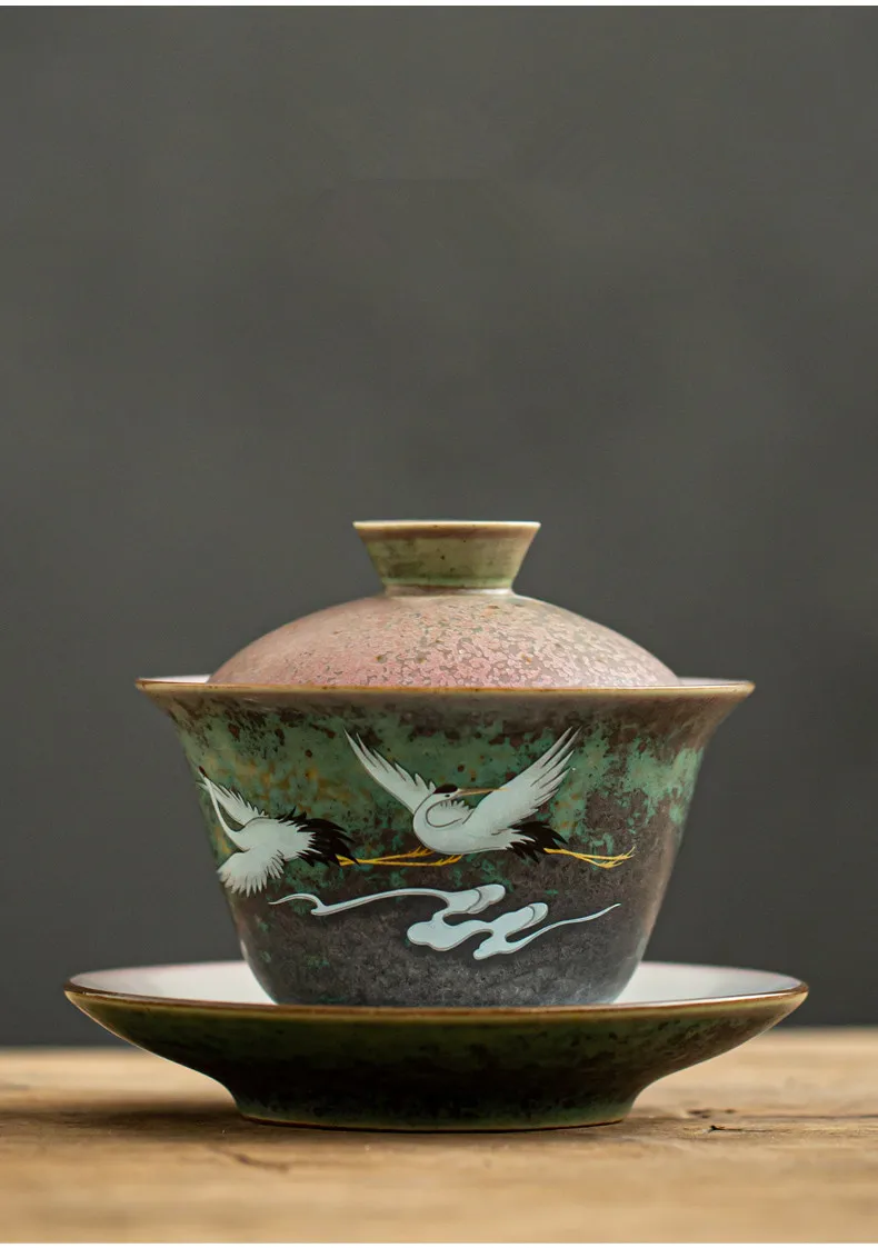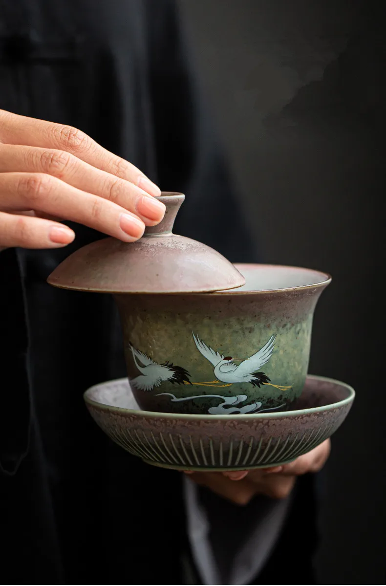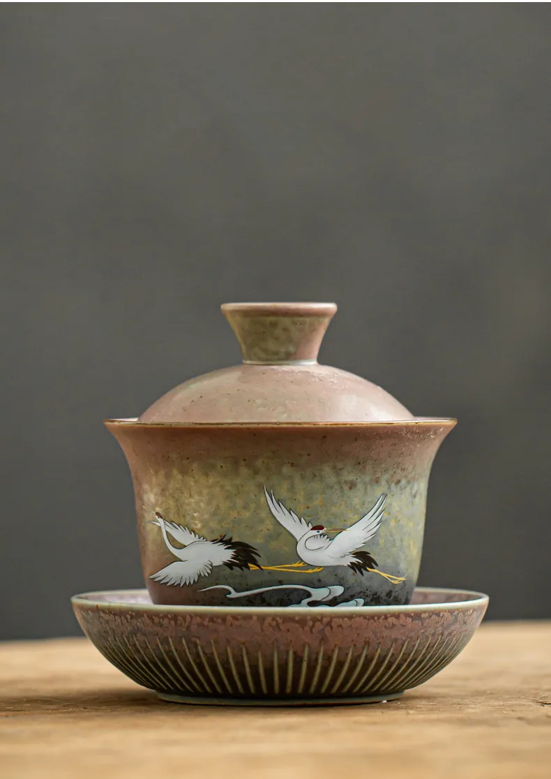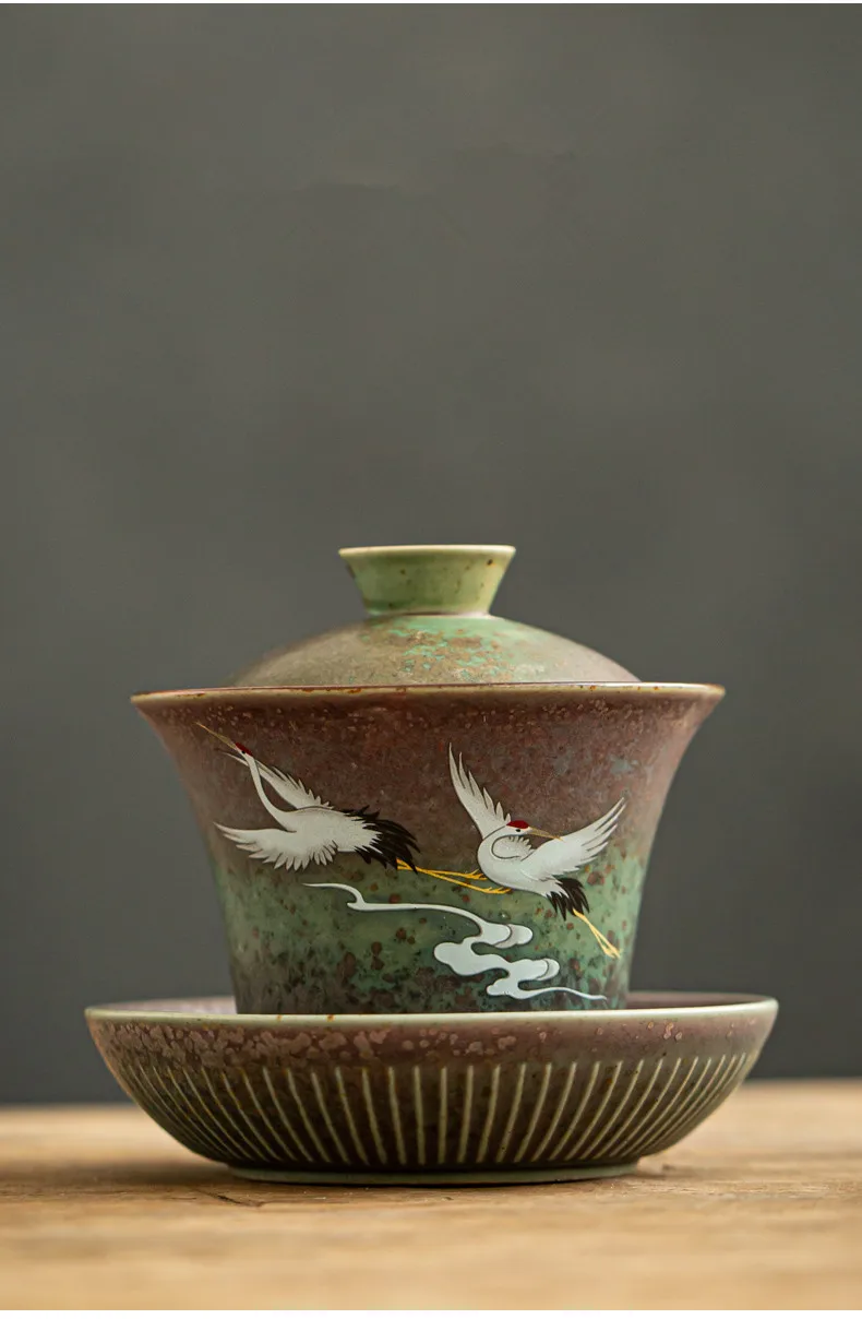 Anti-scald Large Ceramic Retro Tea Cover Bowl with Lid, Sancai Gaiwan Single Tea Bowl, Hand Painted Shining Crane Cover Bowl