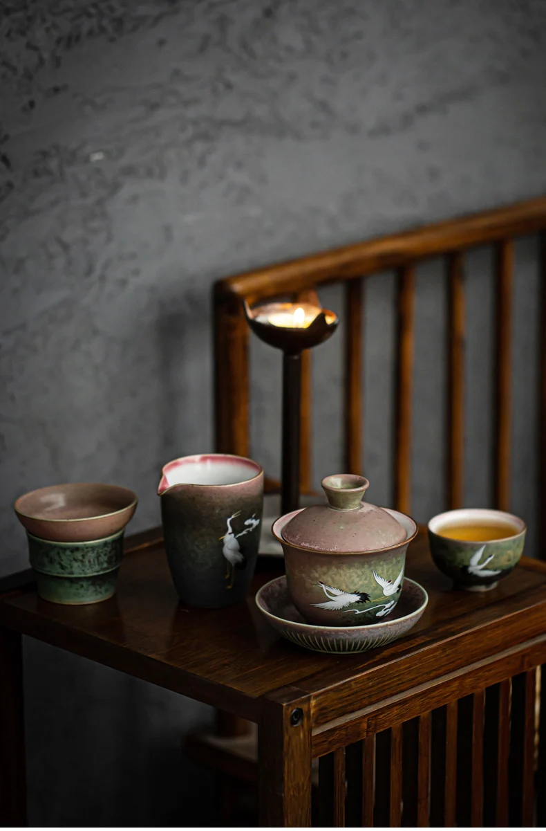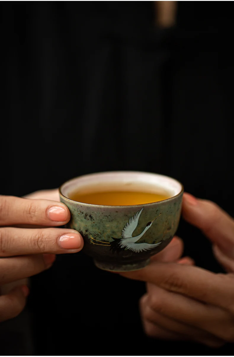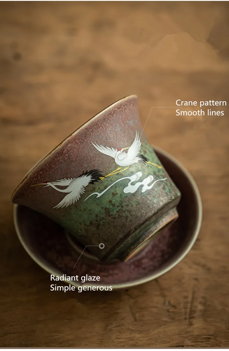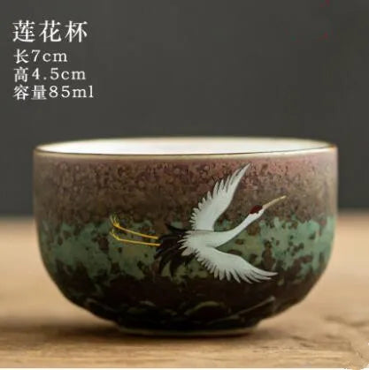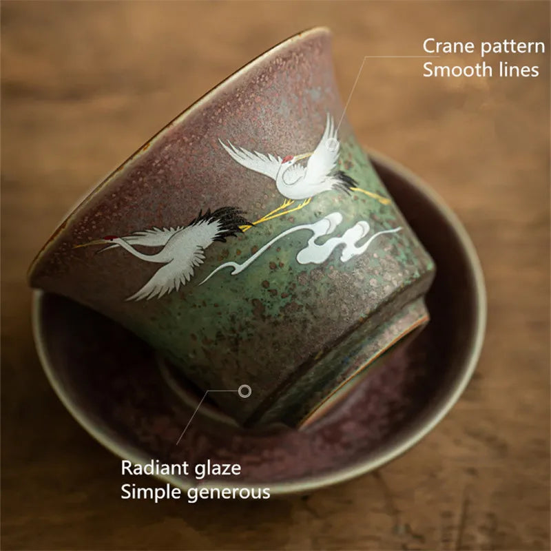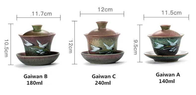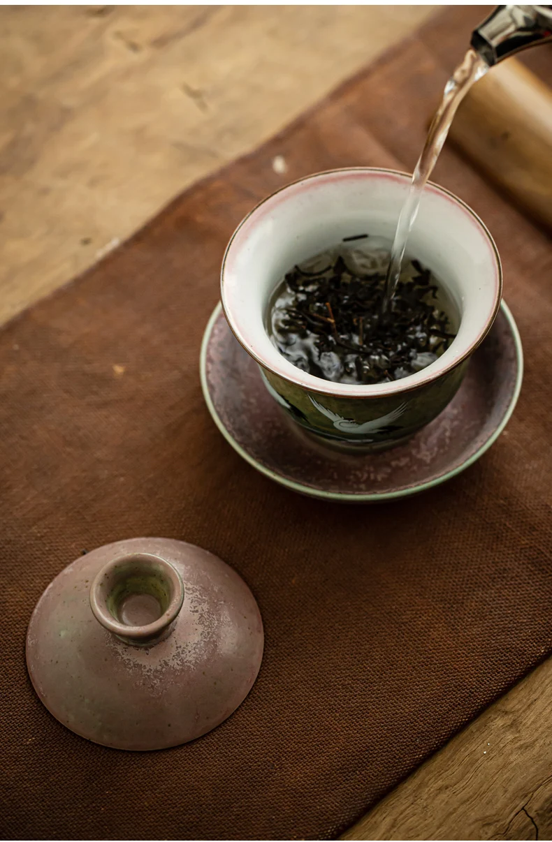 Anti-scald Large Ceramic Retro Tea Cover Bowl with Lid, Sancai Gaiwan Single Tea Bowl, Hand Painted Shining Crane Cover Bowl