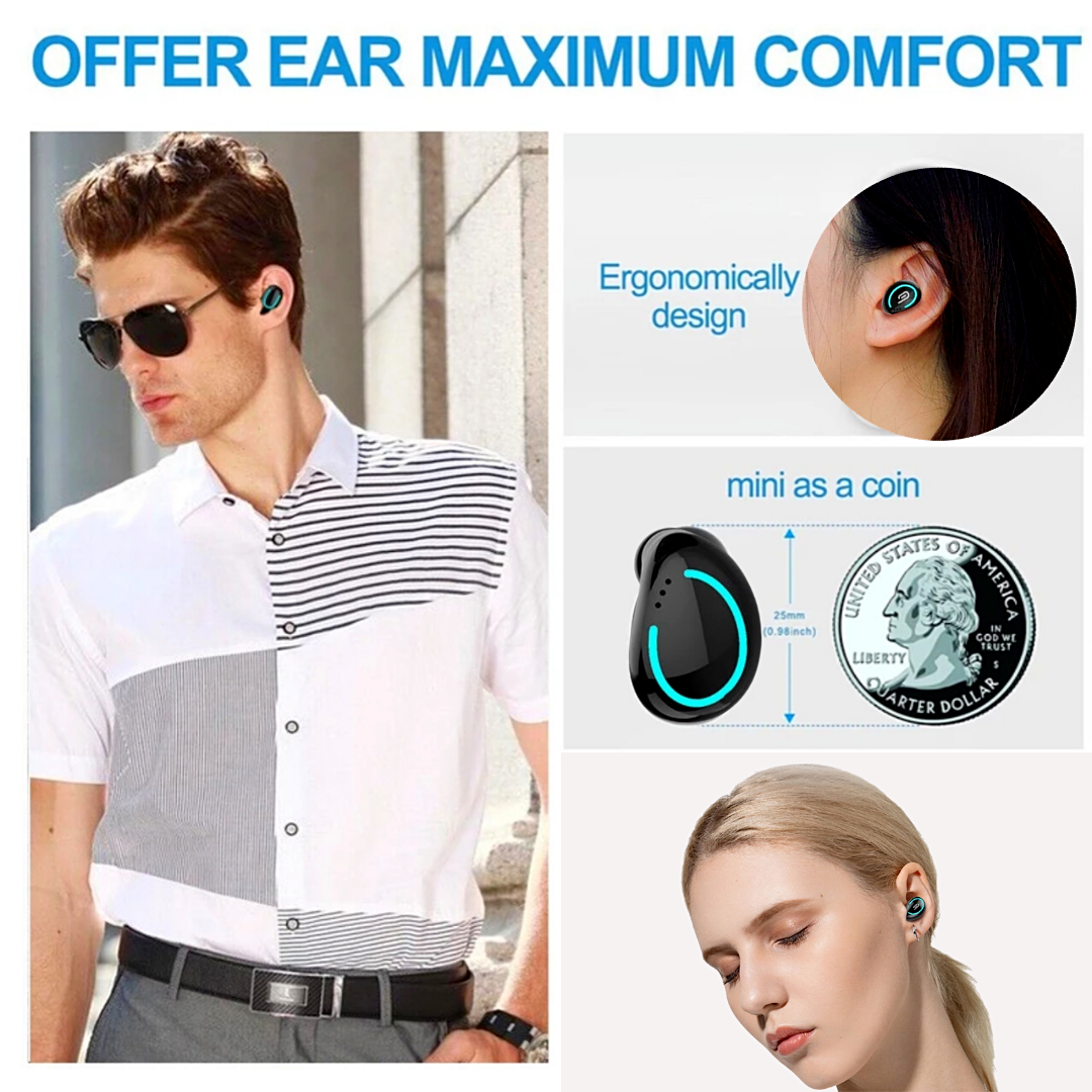 Description: The wireless binaural design separates the left and right ear canals, which can be used alone or in the ears. BT 5.0 technology has lower power consumption, more stable signal transmission, longer connection distance, and faster speed. IPX6 deep waterproof design, waterproof and sweat-resistant anti-corrosion material, enjoy sports, smart touch, more sensitive control. Ergonomic design makes it painless to use for a long time. Built-in high-definition microphone, intelligent noise reduction, high-quality calls. Parameters: Bluetooth version: V5.0 Input voltage: 5V Frequency response: 100Hx-8KHz Signal to noise ratio: ≧ 70DB Operation method: touch Headphone material: PC material Bluetooth distance: about 10m Waterproof: IPX6 waterproof Connection method: use once / twice Single ear capacity: 50 mA Auto start: support Automatic pairing: support Pair headphones: 1. Support Bluetooth headset to play / pause music 2. Support music cut songs (songs up and down) 3. Support answer / hang up calls / reject calls, redial the end number 4. Call voice reminder 5. Bluetooth headset operation voice prompt function 6. ISO system power indicator 7. Call SIRI 8. Supports addition and subtraction of volume 9. Suitable for smart phones / e-books, computers, tablets, etc. Bluetooth enabled with Bluetooth modules Color: black Material: ABS 1 Piece Simple Headphone: Compact and small, easy to use and portable. Superior sound quality and IP7 waterproof. Adopted with true wireless technology, these wireless headphones realize that they free your ears from the cable tie, and you no longer need to tolerate tangled cables. Color: black Material: ABS Size: 12.3 * 8.2 * 3.7cm