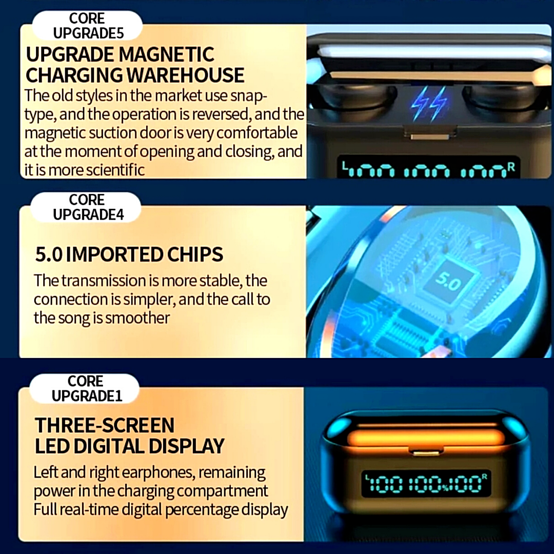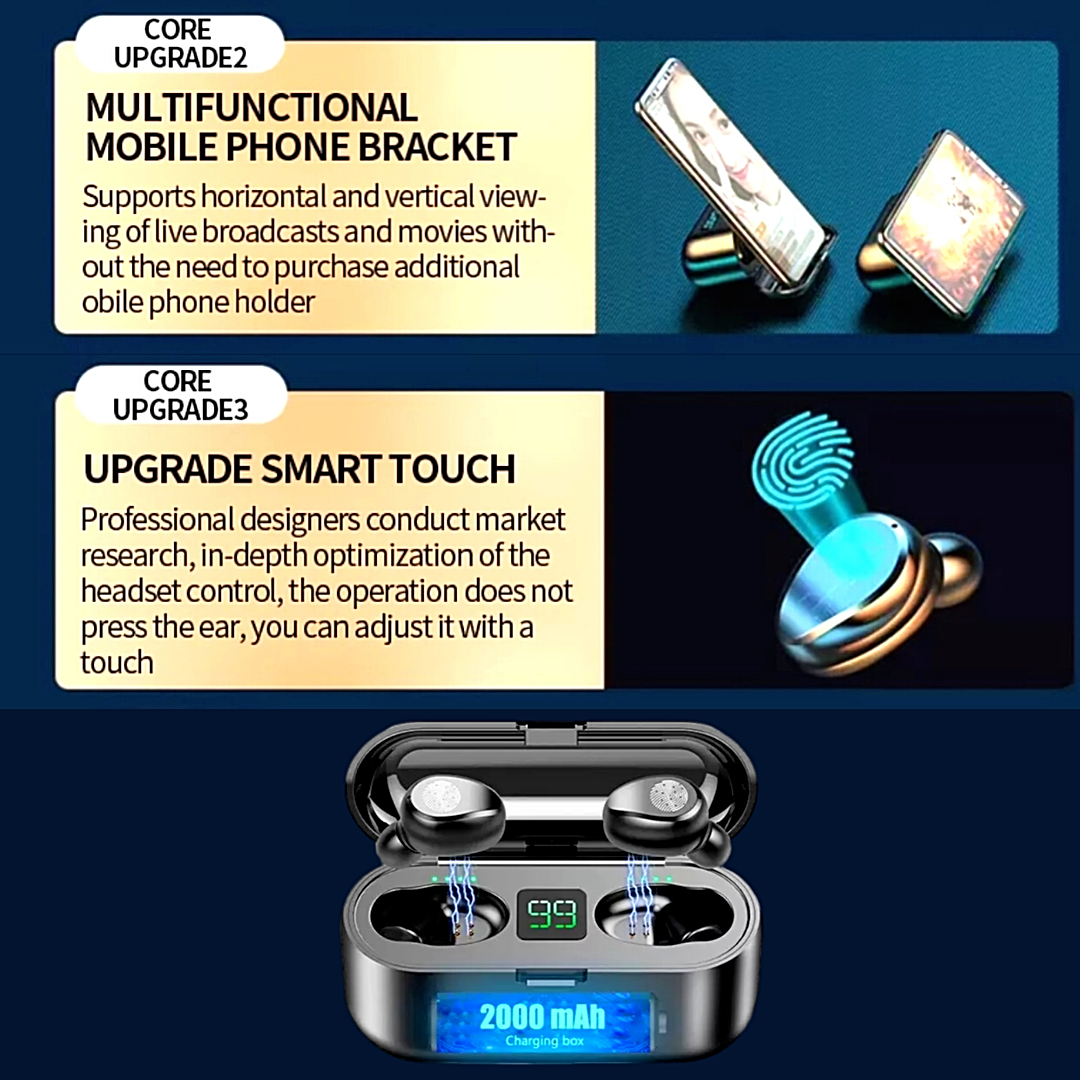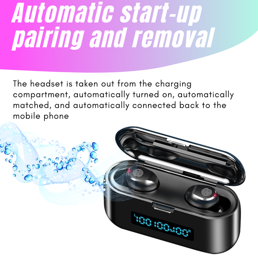 Comfort and Bluetooth Technology: True wireless earbuds with Bluetooth 5.0 chip, faster transmission, and more stable signal. Each sport headphones have a built-in microphone that allows you to enjoy hands-free calling and voice assistants. 3 Different sized ear tips make you more comfortable to wear. One Step Pair: No need to press any button, this TWS headphone is automatically turned on and paired after being removed from the charging box; When you put it back the charging box, it will automatically turn off and start charging. Noise Reduction: CVC8.0 intelligent noise reduction technology enables you to enjoy HiFi sound effect music or have HD phone talking. LED Power Display: 1200mah Large capacity magnetic induction charging case. The charging case can be used as a phone holder, liberate your hands while watching TV; It can also be used to charge for mobile phones, no need to worry about cell phone lack of power. Low power consumption, long battery life, long standby time is available after fully charged. How to Use: Take out and auto startup, connect to Bluetooth devices, more convenient to use. The earbuds can be used separately or together, you can choose the modes you like. Other Functions: The earbuds could be used to answer/reject calling, skip/play/pause songs, and activate voice assistants, such as Siri and android voice assistant. With intelligent voice reminders, helping you to know the real-time status of your headset. Life grade waterproof level, no need to worry about getting wet by rain and sweat. Small Design: Small and Mini size design, it can even hide in your ears. Specification Type Headset Color Black Bluetooth Version Bluetooth 5.0 Transmission Distance 10 meters (33 feet) Bluetooth Protocol HFP/HSP/A2DP/AVRCP Frequency Range 2042MHZ-2480MHZ Waterproof Level Life waterproof Music Time (Single Use) 3-4 hours Call Time (Single Use) 3-4 hours Standby Time (with the Charging Case) About 650 hours Earbuds Battery Capacity 50mAh Charging Case Battery Capacity 1200mAh Charging Time About 1-2 hours Working Temperature -10℃-55℃ Input Current 5V--1A Output Current 5V--1A Battery Type 3.7V Connection Method Single/double free to use Function Type Smart touch function Connectivity USB Microphone Type Built-In Number of Earpieces Double Wireless Technology Bluetooth Features Built-In, Built-in Microphone, Built-In On/Off Switch, Call functions, Extra Bass, HD Voice, Noise Cancellation, Noise Isolation, Rechargeable Battery, Replaceable Ear Tips, Stereo, Sweat Proof, Smart touch function, Volume Control, Waterproof, Charging Box, charging dock NOTE: Please if your team put it in binaural mode by accident please follow these steps to put it in normal mode again ] Usage of binaural pairing: 1. First delete the headset connection record in the bluetooth of the mobile phone, and then turn off the bluetooth of the mobile phone; 2. Press for about 6 seconds when the headset is off (red and blue lights flash) and let go; 3. Double-click the right earphone and wait for about 5 seconds (it will prompt to find the slave, and the left and right channels will be prompted if the pair is successful); 4. After successful pairing, the red and blue lights of the left earphone will flash, while the right earphone will not flash. At this time, you can turn on the bluetooth connection of the mobile phone. Package Includes 2 * Headset 1 * Charging Case 1 * USB Cable 1 * User Manual 6 * Earplugs