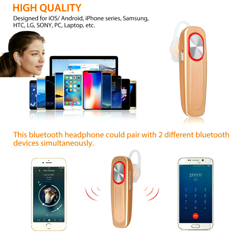 Características del producto: Bluetooth 4.1: la tecnología Bluetooth 4.1 garantiza una conectividad estable y una transmisión suave, sin enredos ni latencia. Batería ultra larga: este auricular Bluetooth integrado en una batería de litio de 300 mAh, hasta 32 horas de tiempo de música, 36 horas de tiempo de conversación, 100 días de espera, solo 2-3 horas de tiempo de carga. Cancelación de ruido: el procesador Bluetooth estéreo RDA y la tecnología Top CVC 6.0 de cancelación de ruido filtrarán automáticamente el ruido y le brindarán un sonido más claro. Auriculares inalámbricos: los auriculares sin cable no le brindarán nada más que comodidad. Hasta 10 M de distancia de conexión más larga, le brinda experiencias maravillosas. Cómodo: diseño liviano de 0.35 oz / 10 g. Este auricular ajustable de 360 ° se adapta perfectamente a su oído izquierdo o derecho. Sin carga durante su uso, le brinda comodidad duradera. Especificaciones del producto: Vermittler USB Bluetooth de tipo inalámbrico Vocalismo Prinzip Dynamische Empfindlichkeit 123dB Bertragungsbereich 20-2000 Hz Batería de auriculares 300 mAh Tiempo de conversación aproximadamente 24 horas Tiempo de música alrededor de 24 horas Bluetooth versión 4.1 Estilo gancho para la oreja Conexión inalámbrica El paquete incluye: 1x auriculares bluetooth 1x cable USB 2x gancho para auriculares 1xUserManual