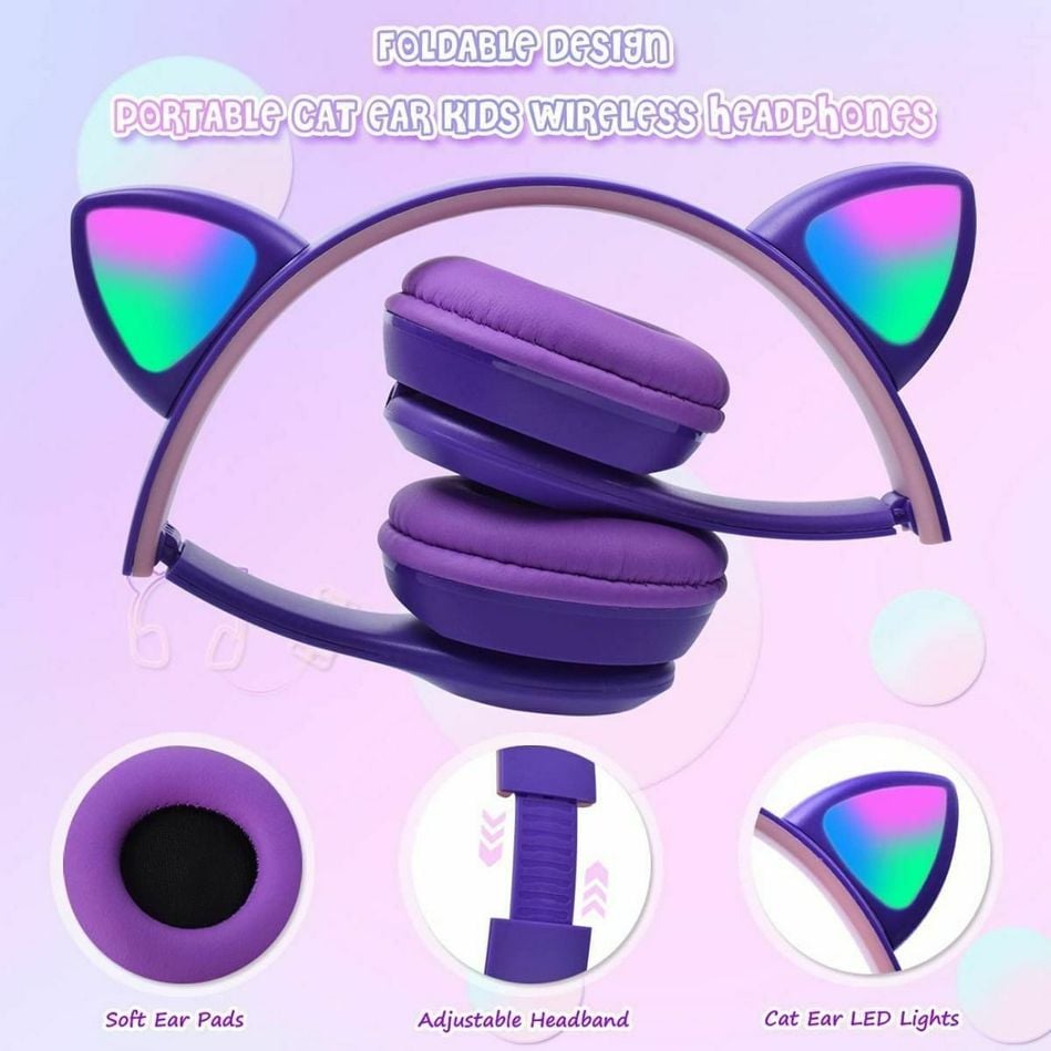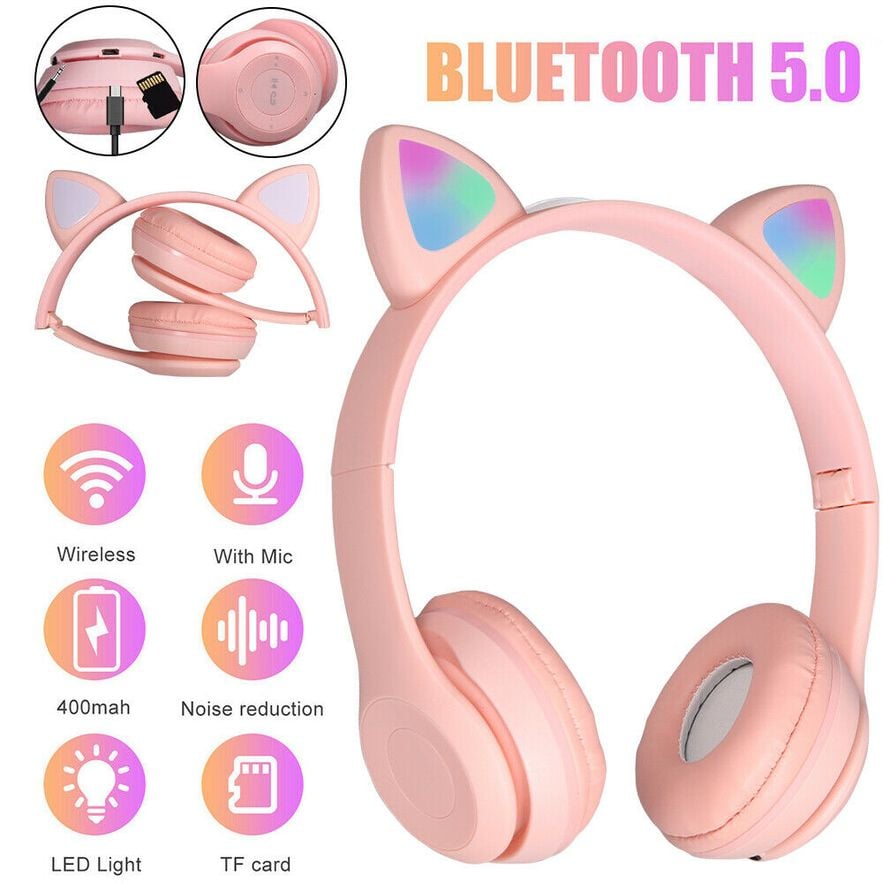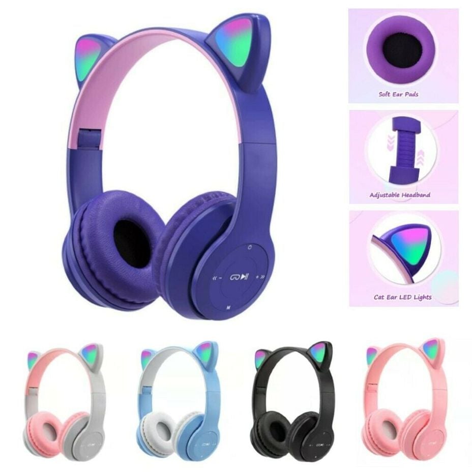 FREE SAME DAY SHIPPING FAST 1-3 DAY DELIVERY Cat-Rabbit Ears Wireless Bluetooth Over-Ear Cup Headphones LED Lights Cat/Rabbit Ears Stereo Bass Sound with Built-In: Microphone, FM Radio, TF Card Reader,Rechargeable Colour: Black/Blue/Pink/Gray