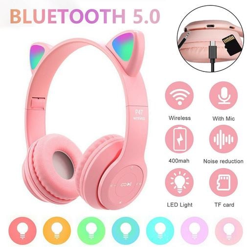 Specifications: Cat Ears Style Design Colorful LED Lights Ears Bluetooth Version: V5.0 EmissionRange<=15m Battery: 3.7V/350mAh Supports all Mobile Phones Bluetooth Supports Music Player and Phone Calls 3.5mm Audio Jack for Optional Wired Headphones With FM Audio TF Card Input Features: Immersive HiFi Sound Designed for an excellent listening experience, Bluetooth headset with CSR chip and around-ear cushion design can provide robust, immersive and Hi-Fi sound. Advanced Compatibility The Bluetooth headset can easily and quickly connect with smartphones, tablets, TVs and other Bluetooth devices within 33 feet, bringing you crystal clear sound effect. Compatible with iPhone, iOS, TV, laptop, PC, iPad and other Bluetooth devices. Foldable and Portable Design The foldable design makes it easy to store them when not in use or during travels. The stainless steel slider headband allows you to find the perfect fit and provide excellent durability. Dual mode: Wireless & Wired In the wireless mode: With a built-in 350mAh battery which provides 12 hours of continuous wireless playback and let you get rid of the tangled cables on the move. In wired mode: Used as a wired headphone with an audio cable. More Joyful & Convenient Wireless & Wired dual mode make you enjoy your music anywhere. Comes with extremely soft Memory-protein ear muff ensuring lasting comfort when you use this wireless headset. Volume control makes it easier to pick up any incoming calls. Never worry about miss any phone call. Included in Package: 1 x Cat-Rabbit Ears Bluetooth Headset with LED Lights 1 x Micro USB Charging Cable 1 x Packing Box 1 x User Manual