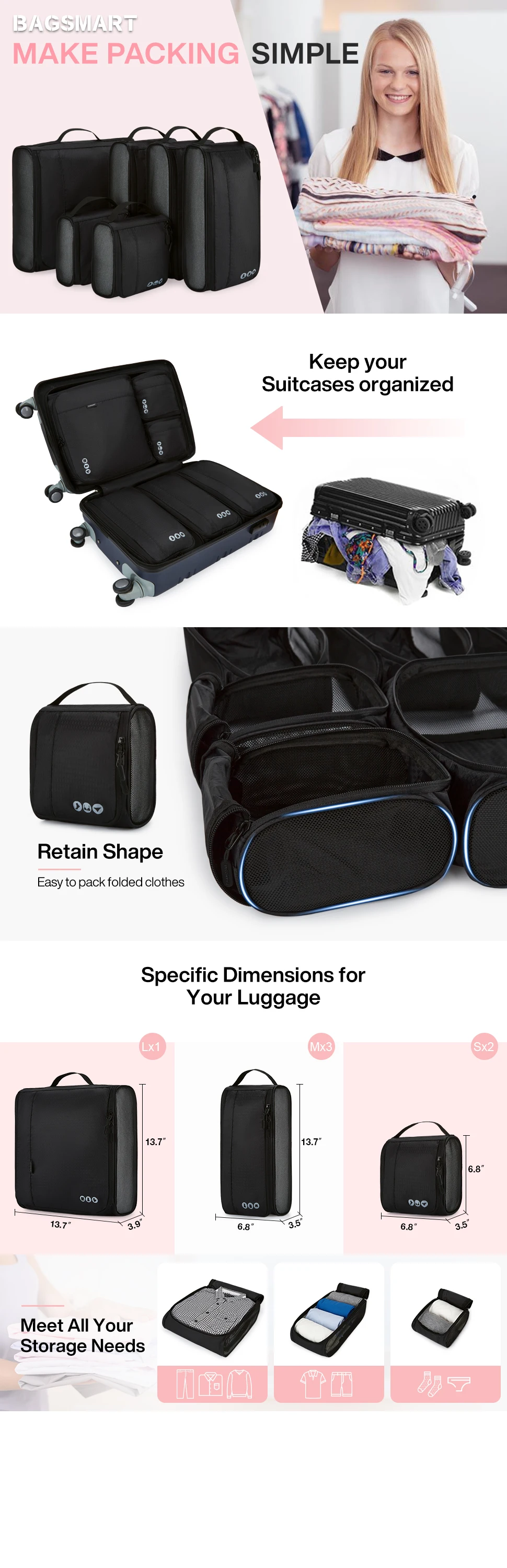 3 Different Sizes(L×H×W) - Large size (13.7’’×3.9’’×13.7’’) for jackets, sweaters, trousers. Medium size (6.8’’×3.5’’×13.7’’) for shirts, T-shirts, shorts. Small size (6.8’’×3.5’’×6.8'') for underwear, socks. Different sizes can be used for different packing purpose and allow you to pack more clothes. Make your luggage clean and tidy.