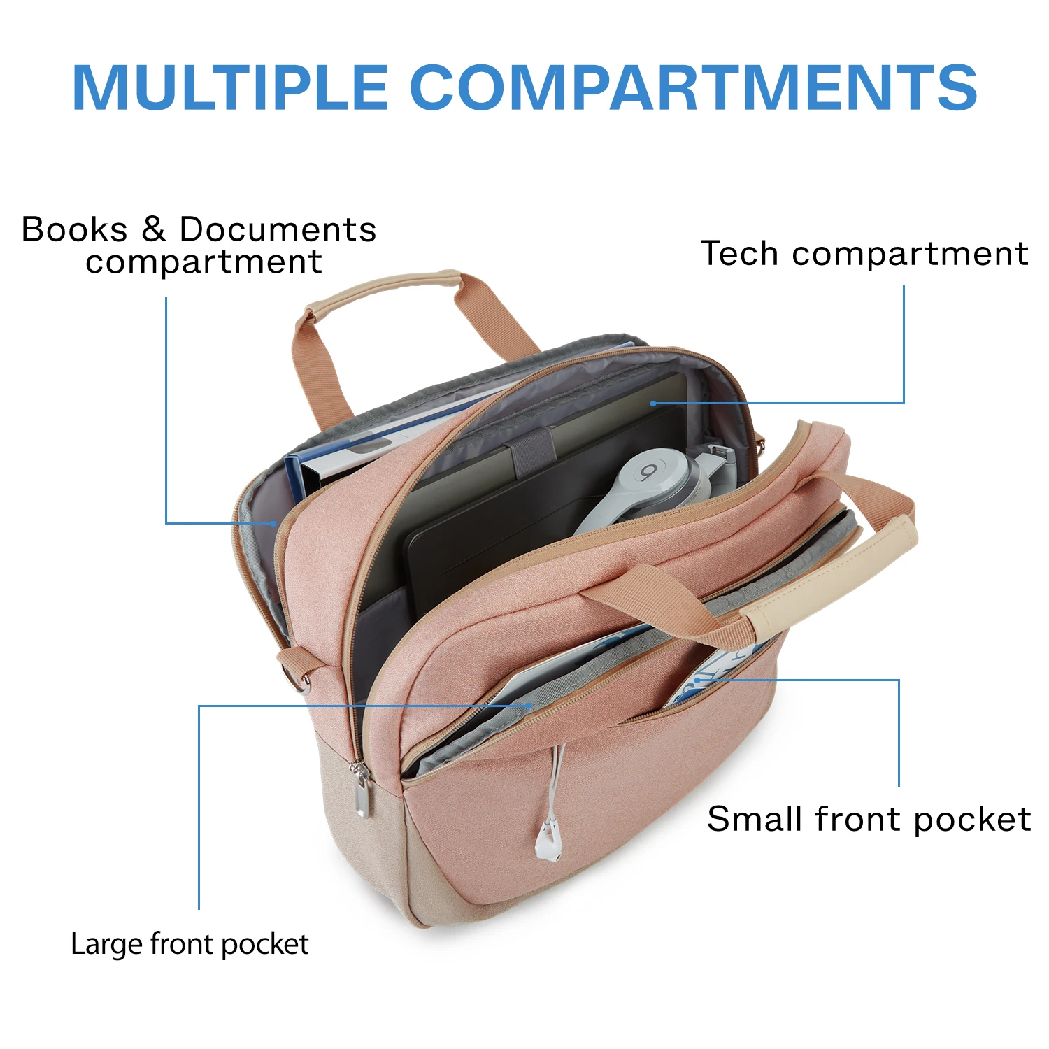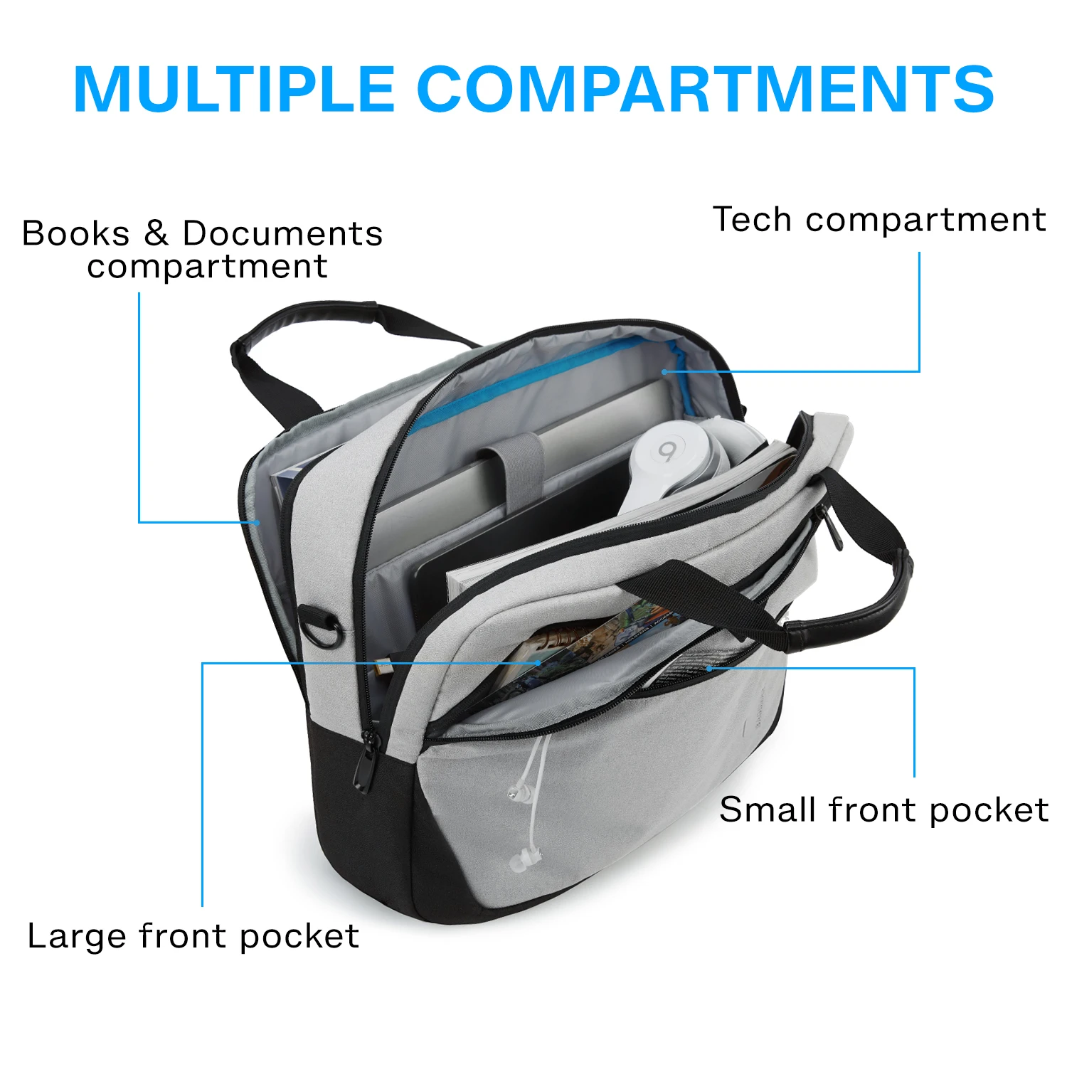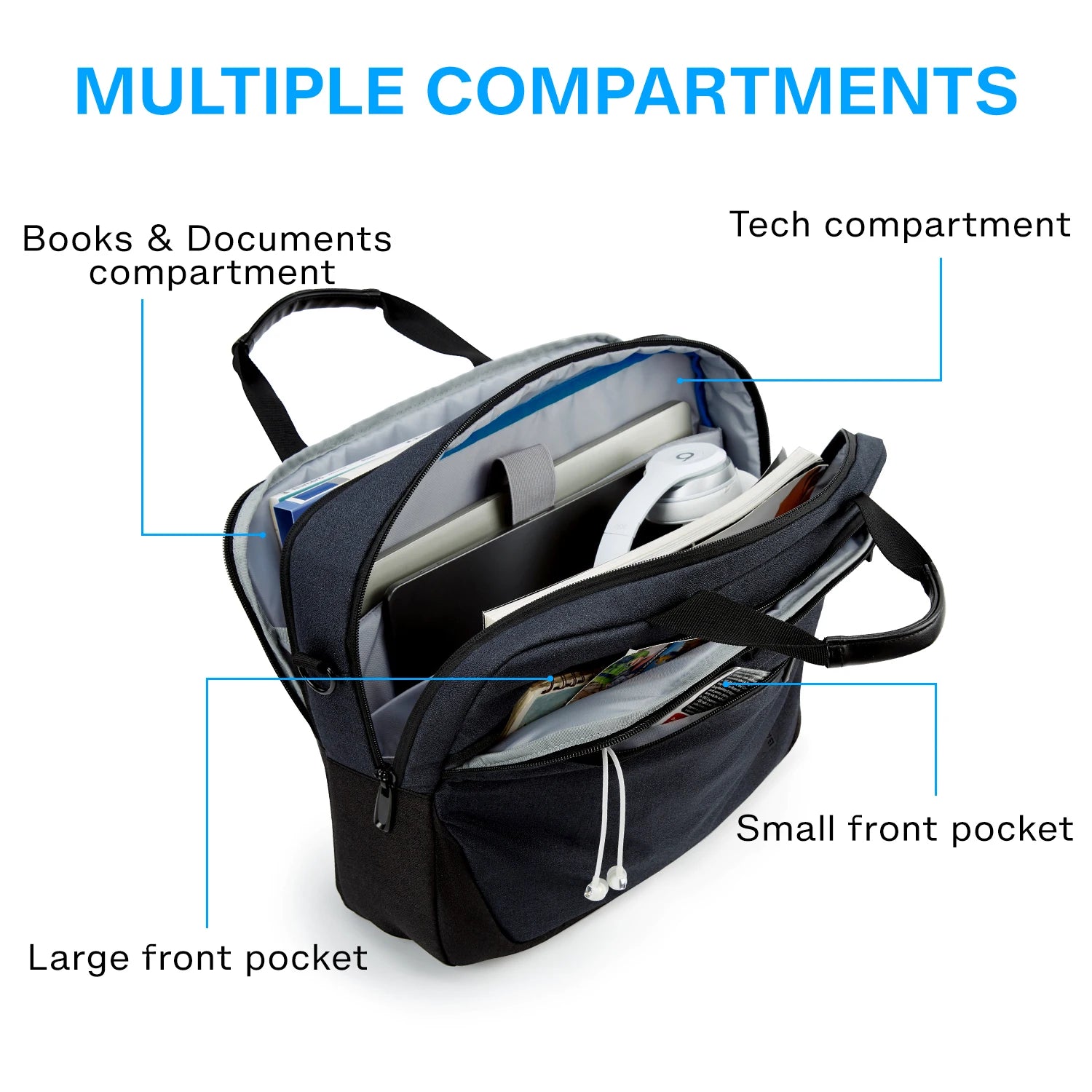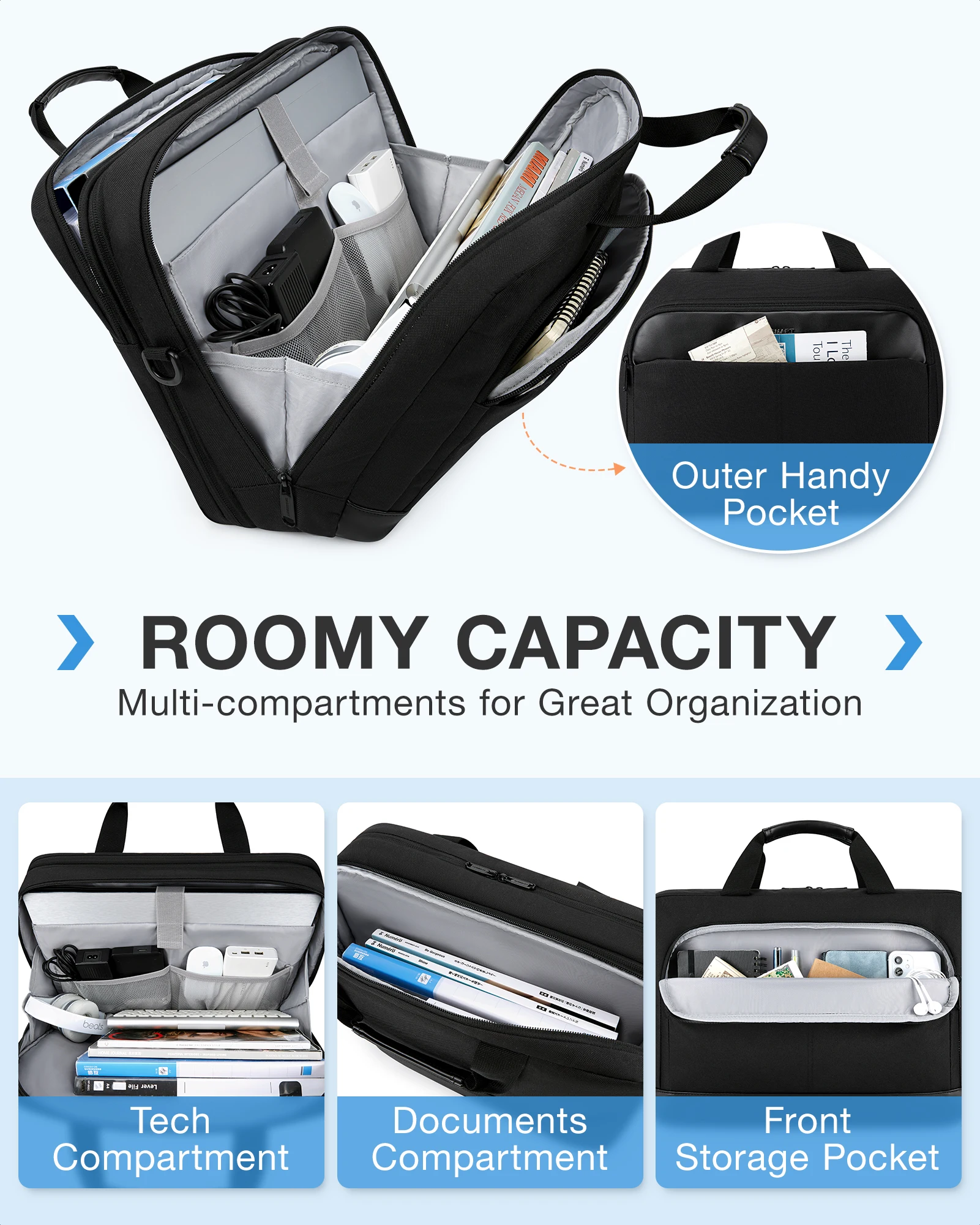 PERFECT CAPACITY & MULTIPLE COMPARTMENTS- 15.7"L x 5.5"W x 12"H; weight: 1.54 lbs, perfect to throw under seat on an airplane. Four compartments to meet all your needs well. The large tech compartment can fit 15.6 inch laptop as well as 15 inch, 14 inch Macbook, 12.9 inch iPad and other tech accessories. Two front pockets allow you to put your daily necessities in an organized manner. And the document compartment can storage your A4 folders, books or magazines.