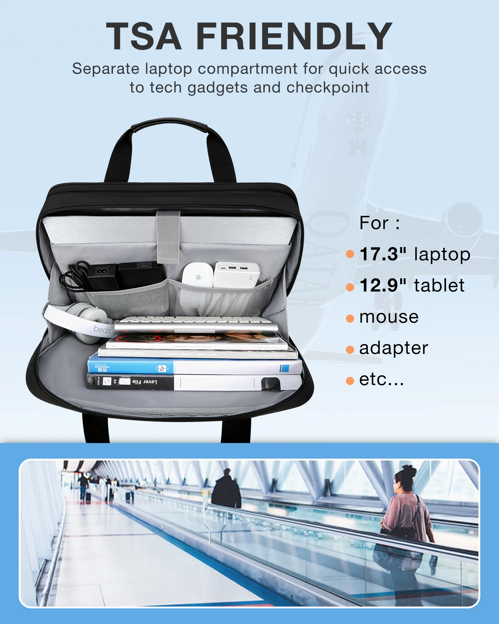 TSA FRIENDLY & ANTITHEFT- Convenient at checkpoint. A separate tech compartment with large opening design can make you quickly pass at airport security, also keeping tech gadgets tidy. Its metal anti-theft zippers will enhance the security of the computer bag.