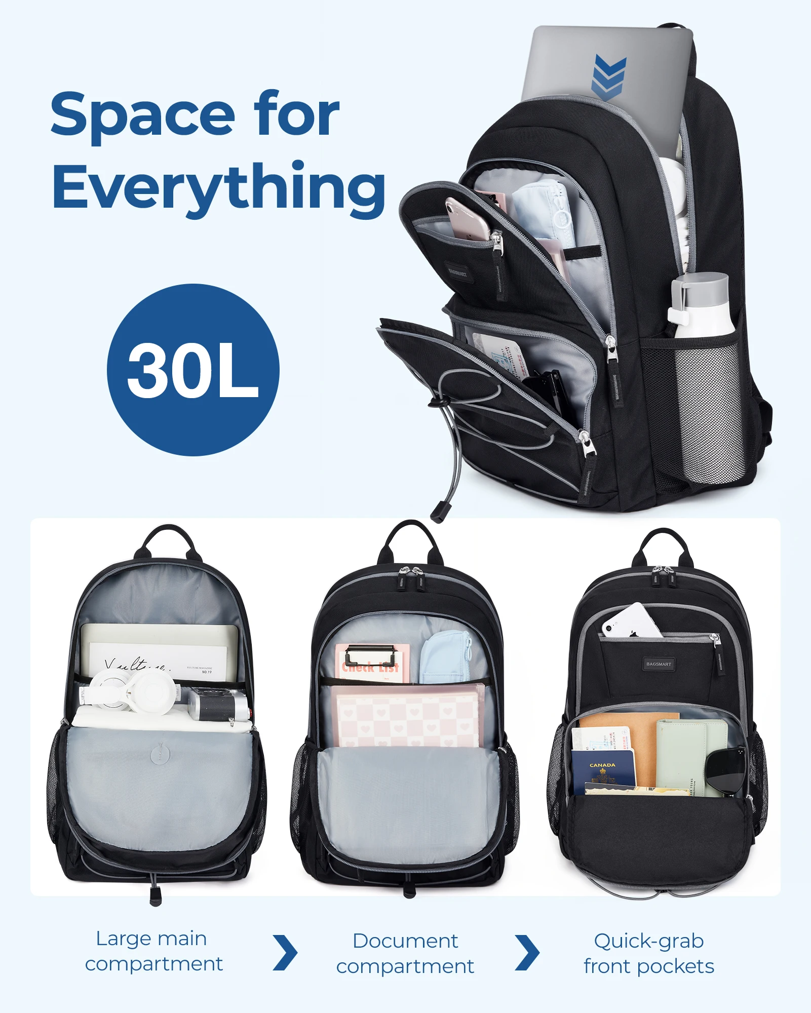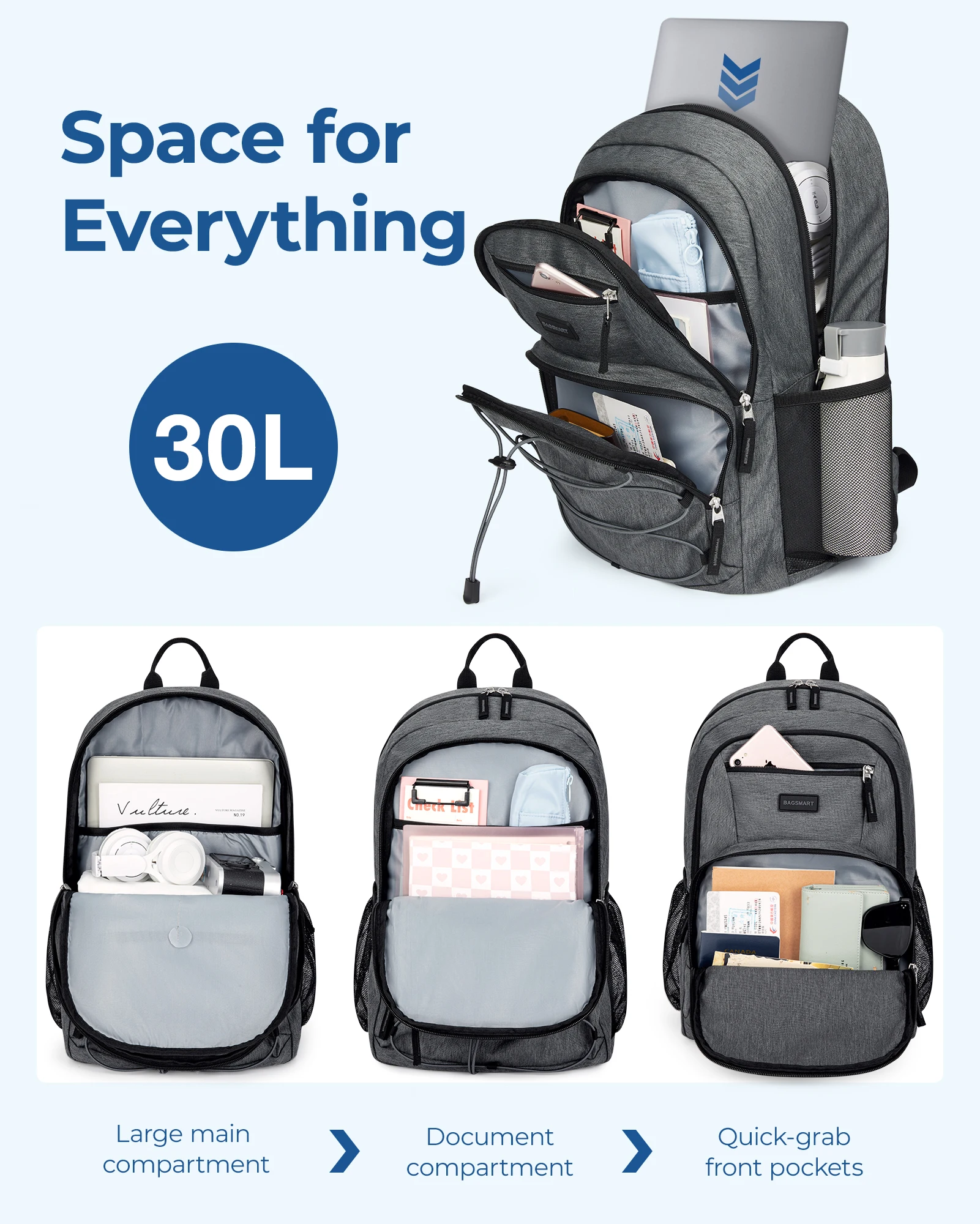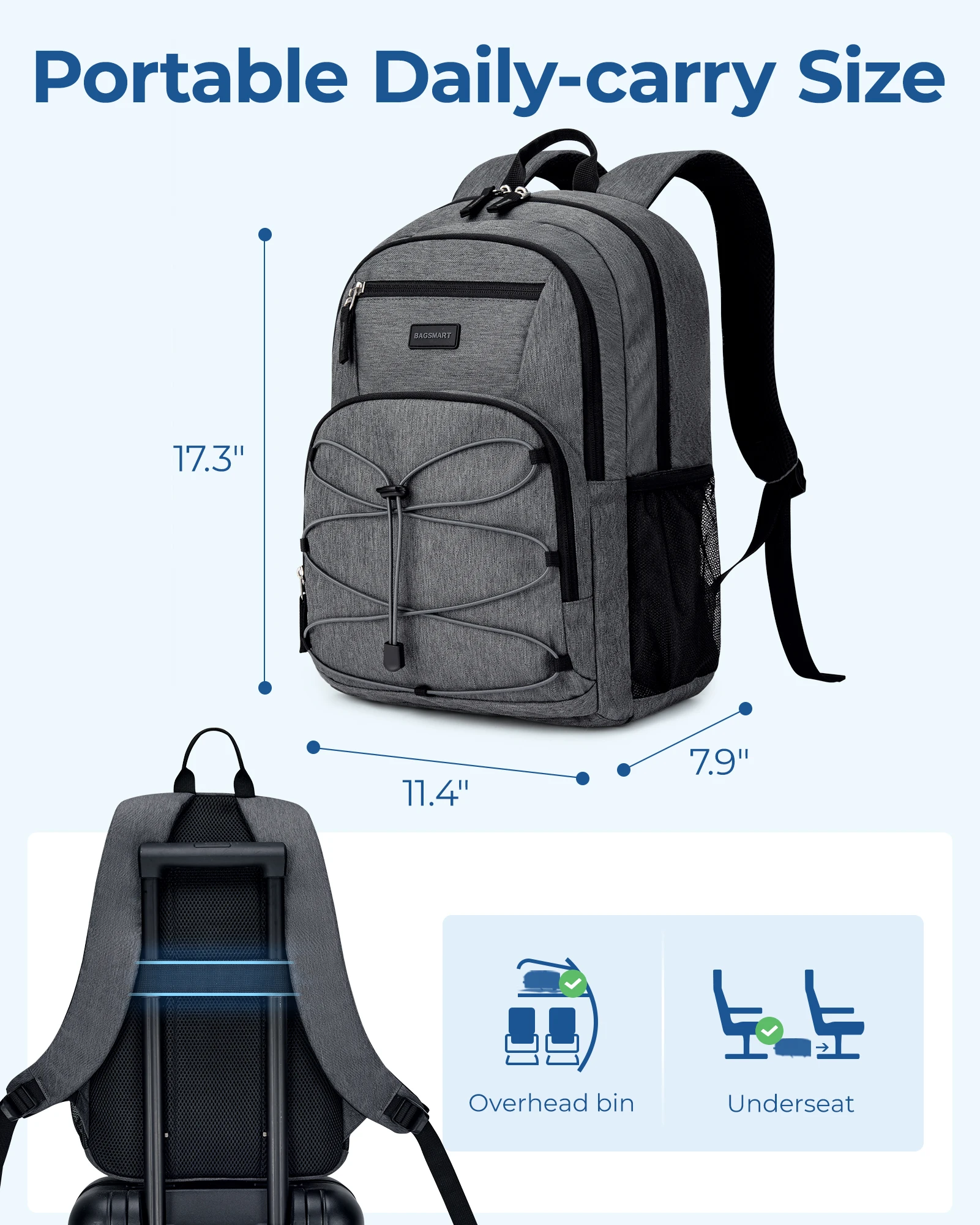 Spacious & Multi-Compartments: BAGSMART Travel Backpack is a versatile carry on backpack that features a generous size of 17.3-11.4-7.9" providing a whopping 30L capacity. With multiple compartments including a Top external zipped pocket, zippered bottom pocket, front zippered pocket, separate laptop compartment, and bottle pocket, this backpack is a perfect companion for travelers seeking efficient storage solutions.