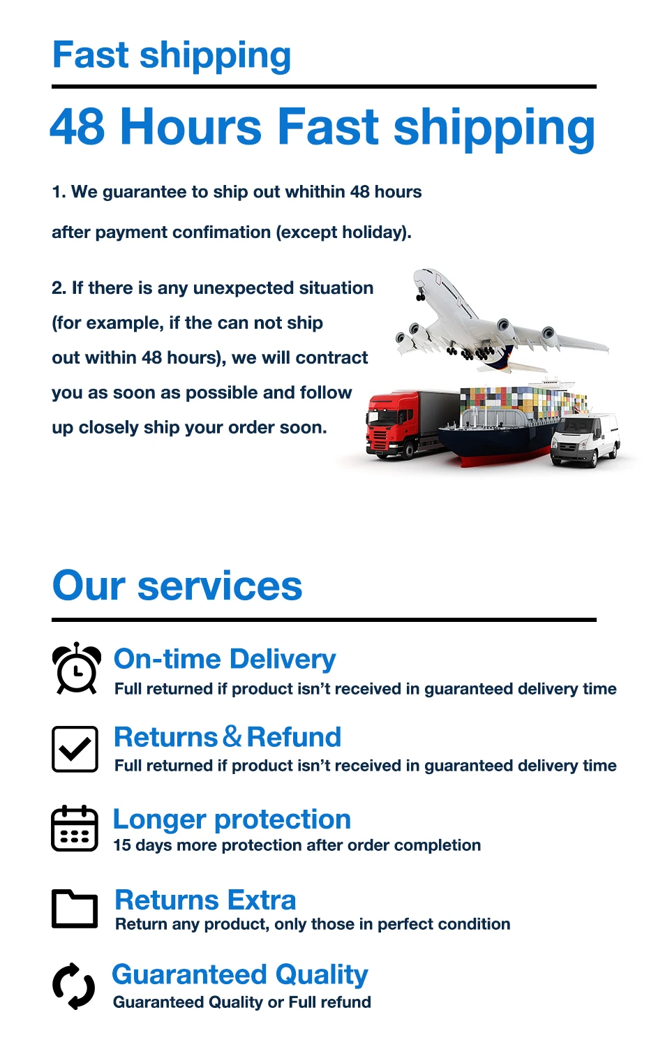 Easy shopping, you rest assured, we are more comfortable! Shopping without worrying about after-sales service, if there is any quality problems, we will unconditionally provide refunds or replacement services, to ensure that you are satisfied until, look forward to working with you!