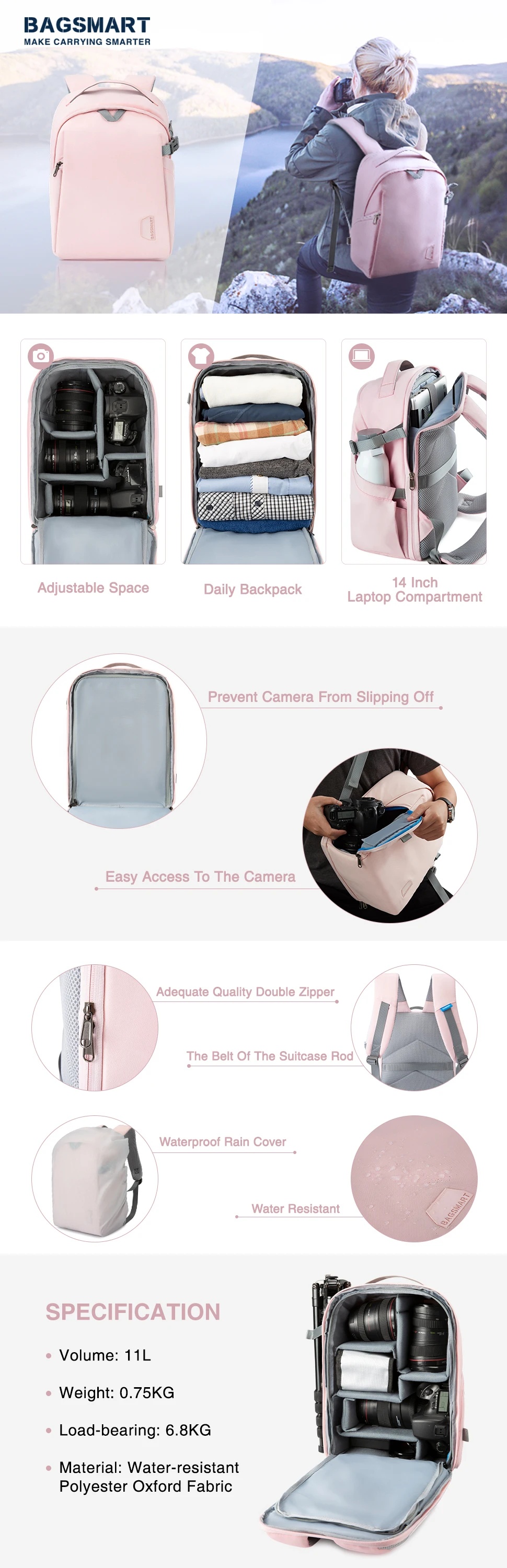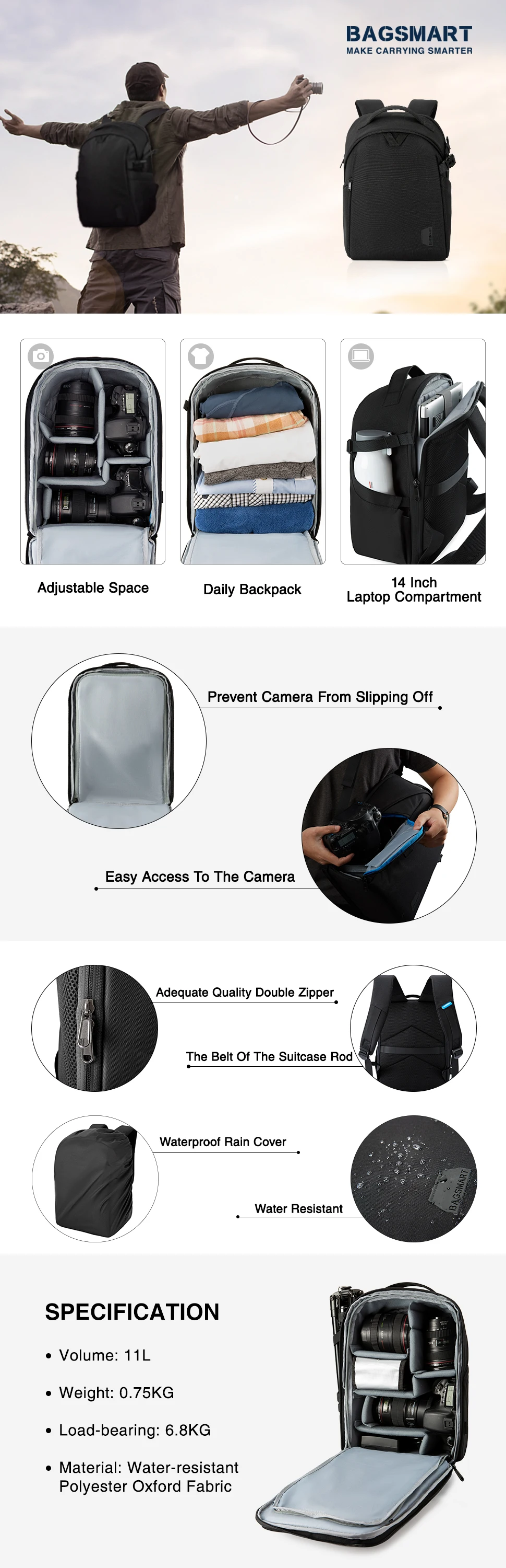 Multi-functional- 5 Removable padded dividers with fully open design makes it easy to insert a DSLR camera and lens without any fuss. A smart strap located on the side of the bag allows you to carry a compact tripod or a selfie pole. Inside pockets to organize memory cards, keys or earphones
