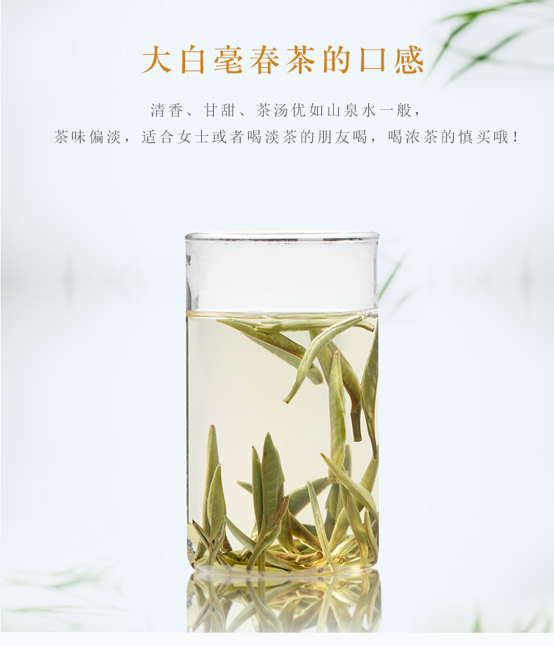 The strips are fat and strong, the amino acid content of Mingqian tea is higher. At this time, the tea has a fragrant and mellow taste. The buds and leaves are covered with hairs, the tea becomes plump and heavy, the pekoe is exposed, and the strips are silvery white.