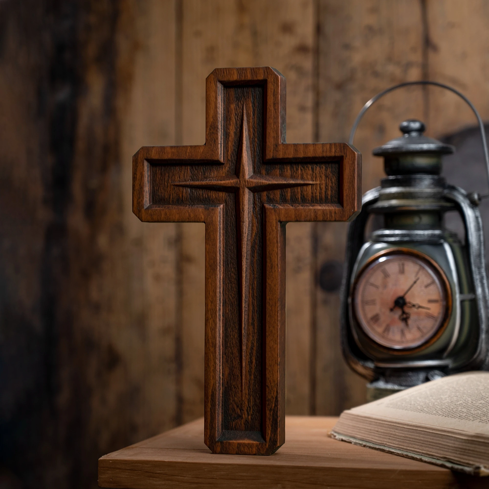 There is a four-pointed star in the center of this cross, representing the Star of Bethlehem or the Star of Natal, which embodies the light of hope for redemption in the darkness and symbolizes the birth of Jesus and the purpose of his birth. The natal star is usually used during Advent and Christmas. Period church decoration.
