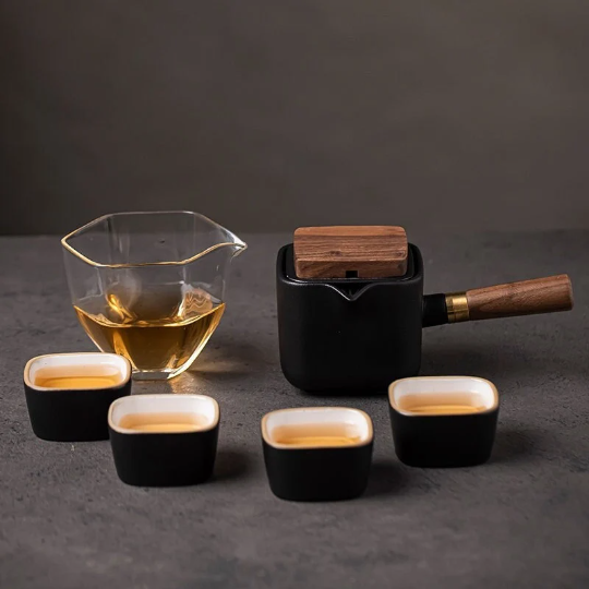 Black Ceramic Kyusu Teapot with 4 Cups and Glass Pitchers