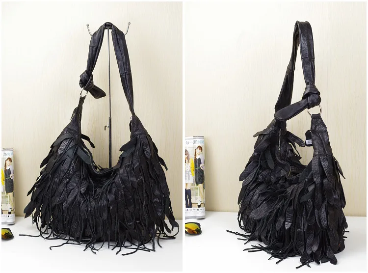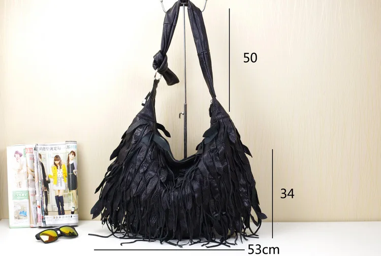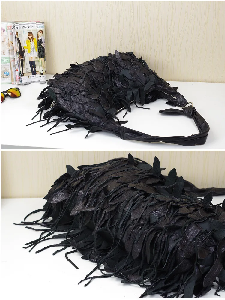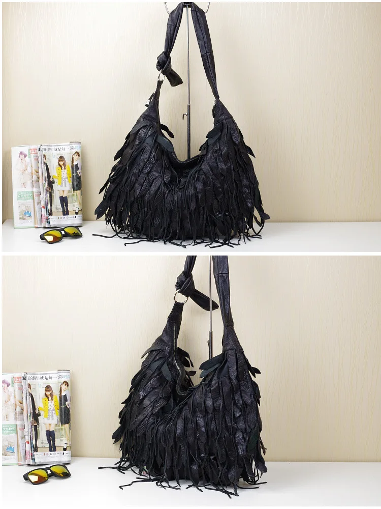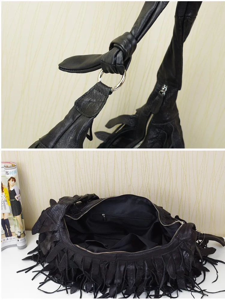Black Genuine leather bag tassel single shoulder messenger bag large capacity beach bag ladies wholesale female bag