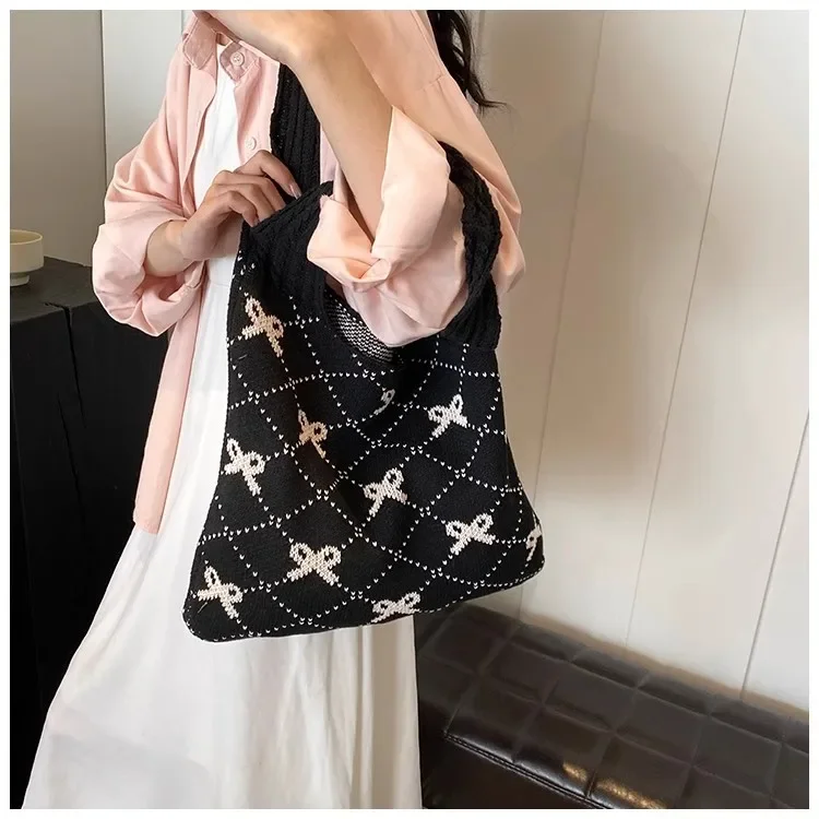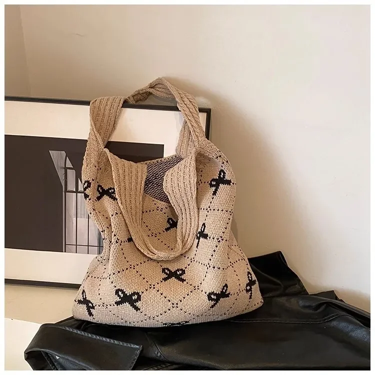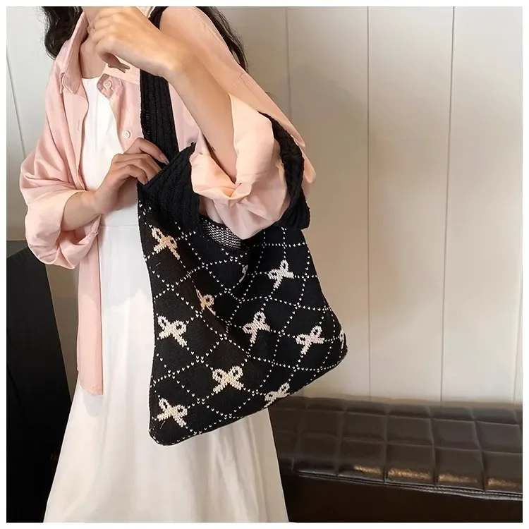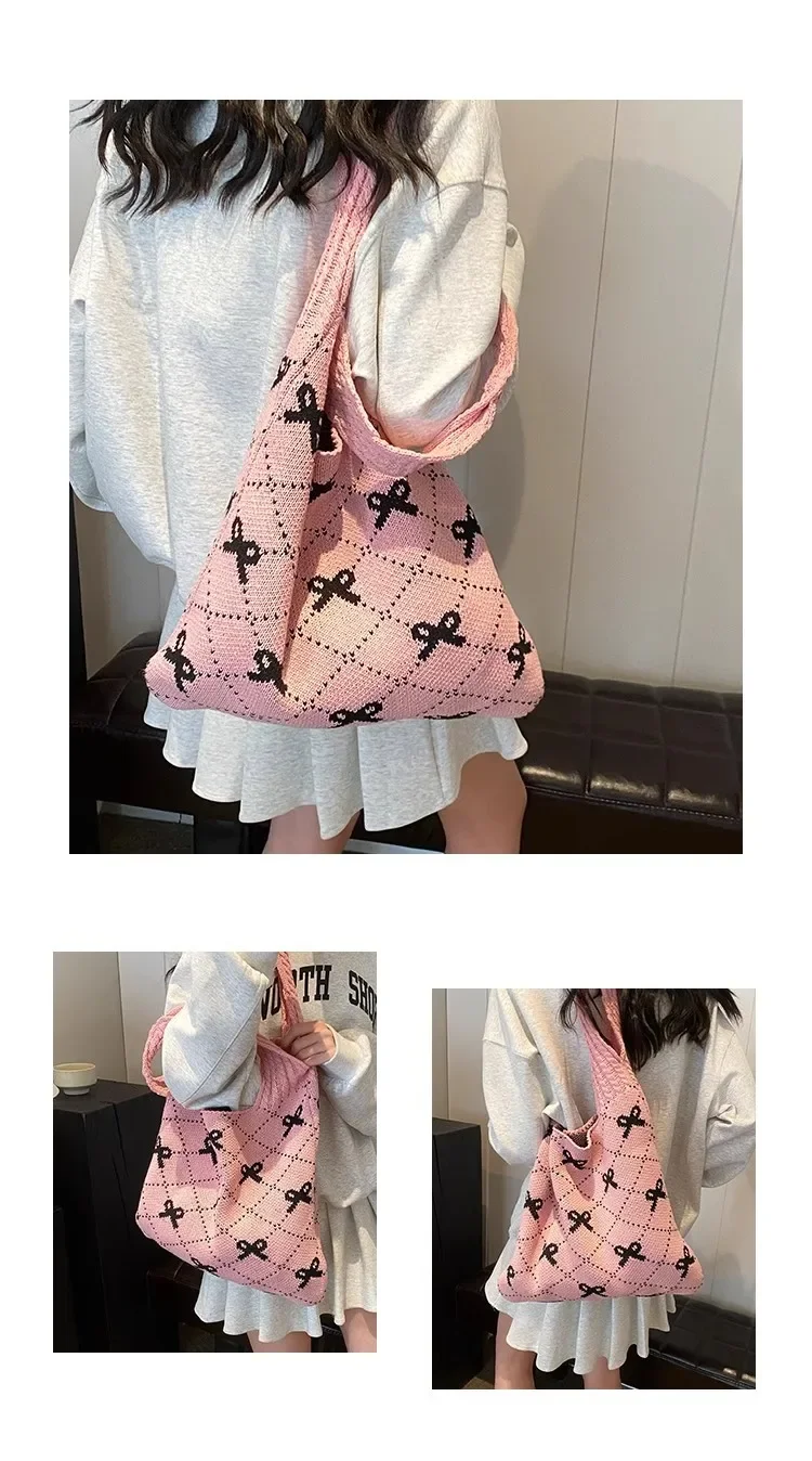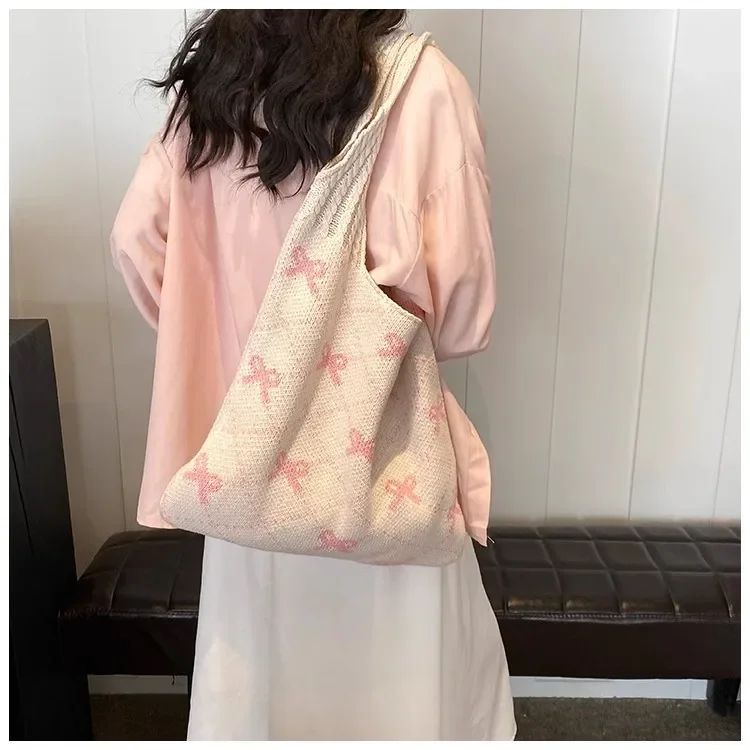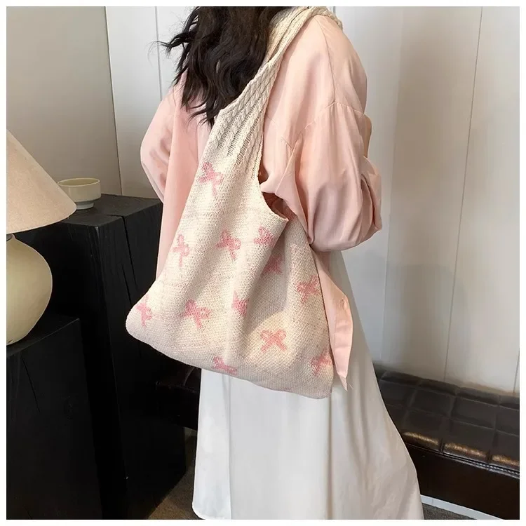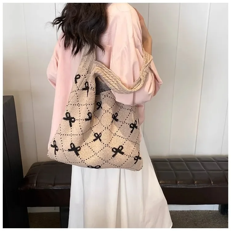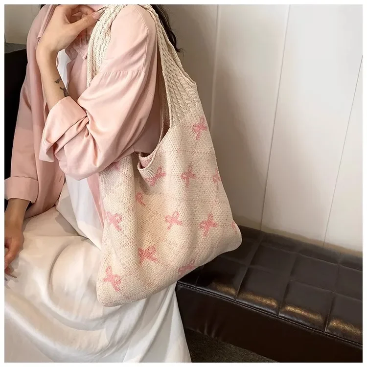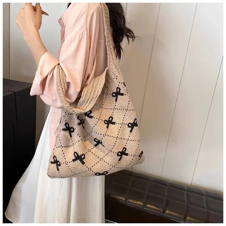 Bow Embellished Woven Shoulder Bags Summer Large Capacity Sweet Style Handbag Korea Casual Gentle Bags New Beautiful Pattern Bag