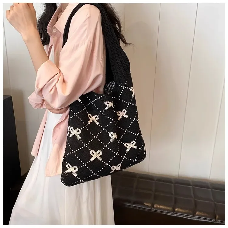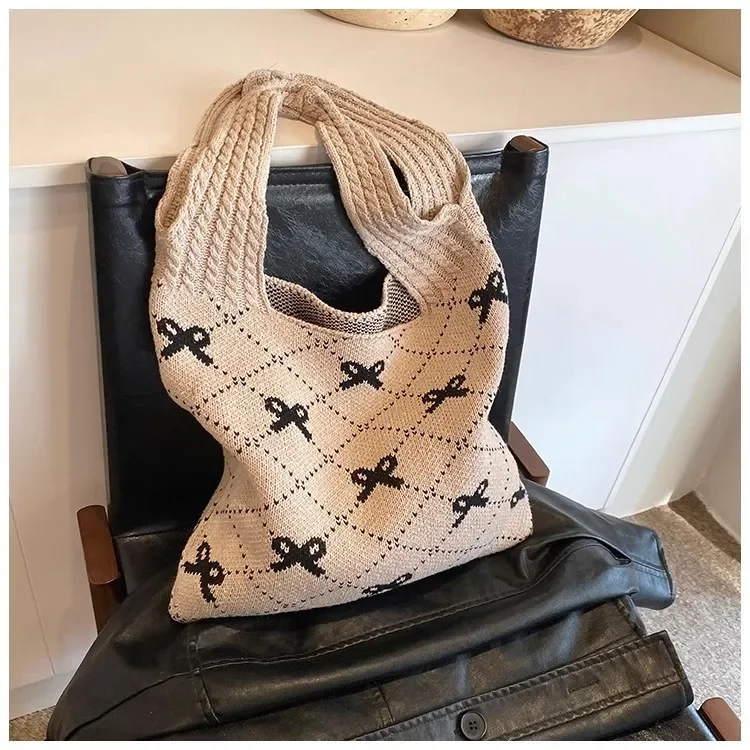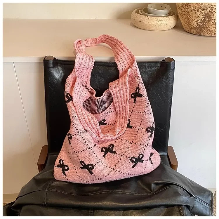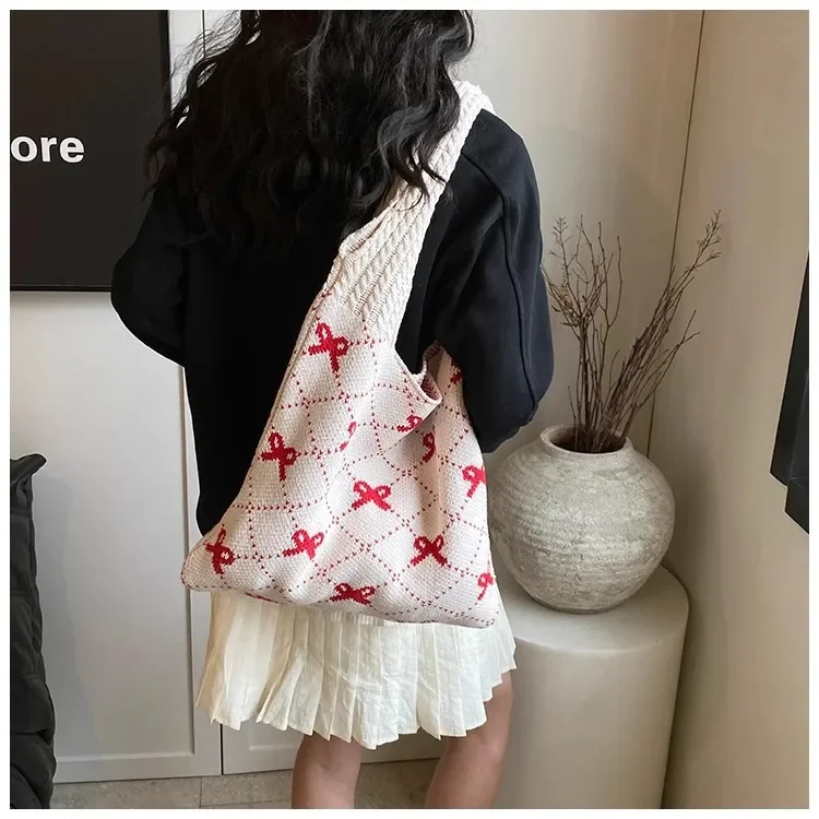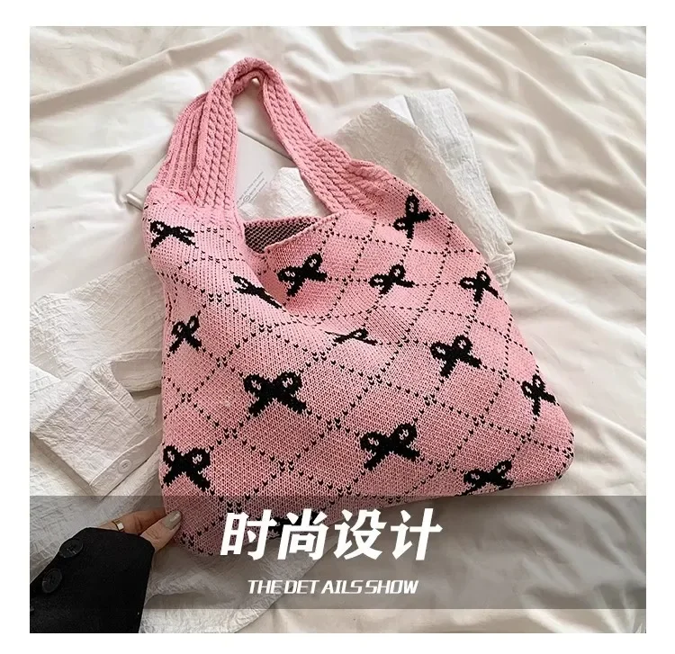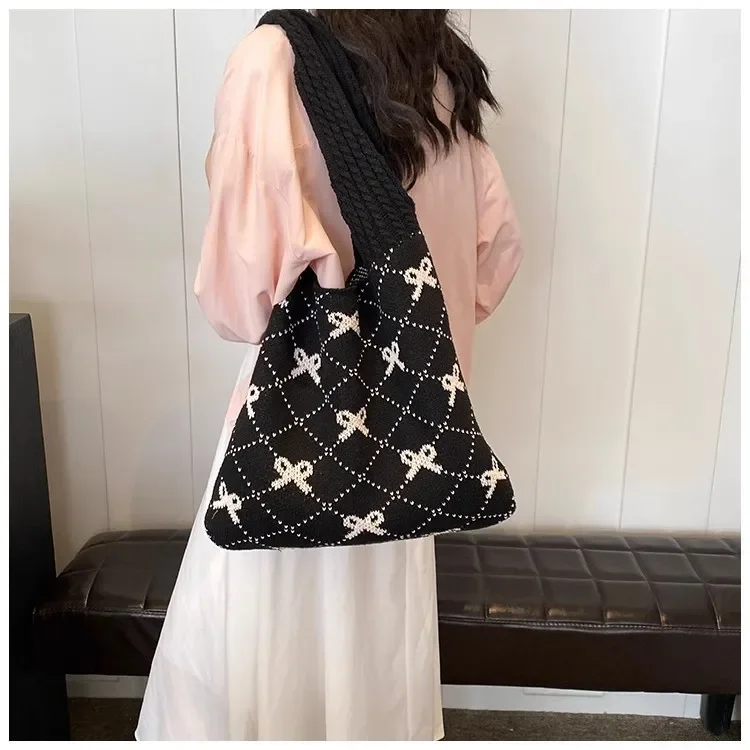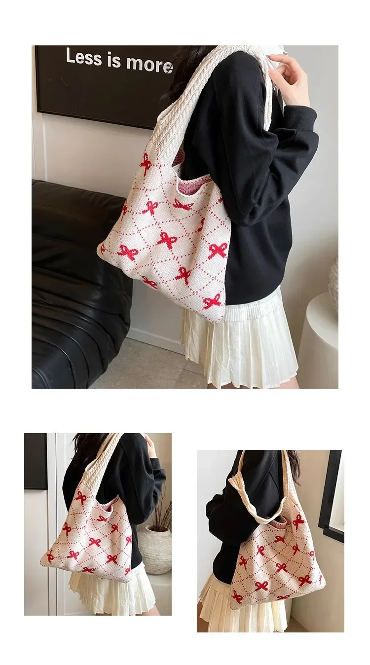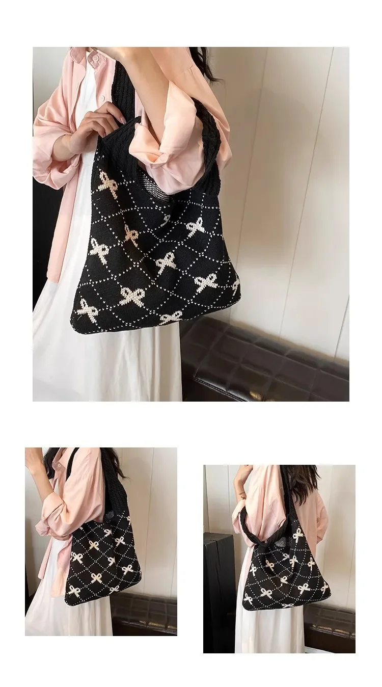 Bow Embellished Woven Shoulder Bags Summer Large Capacity Sweet Style Handbag Korea Casual Gentle Bags New Beautiful Pattern Bag