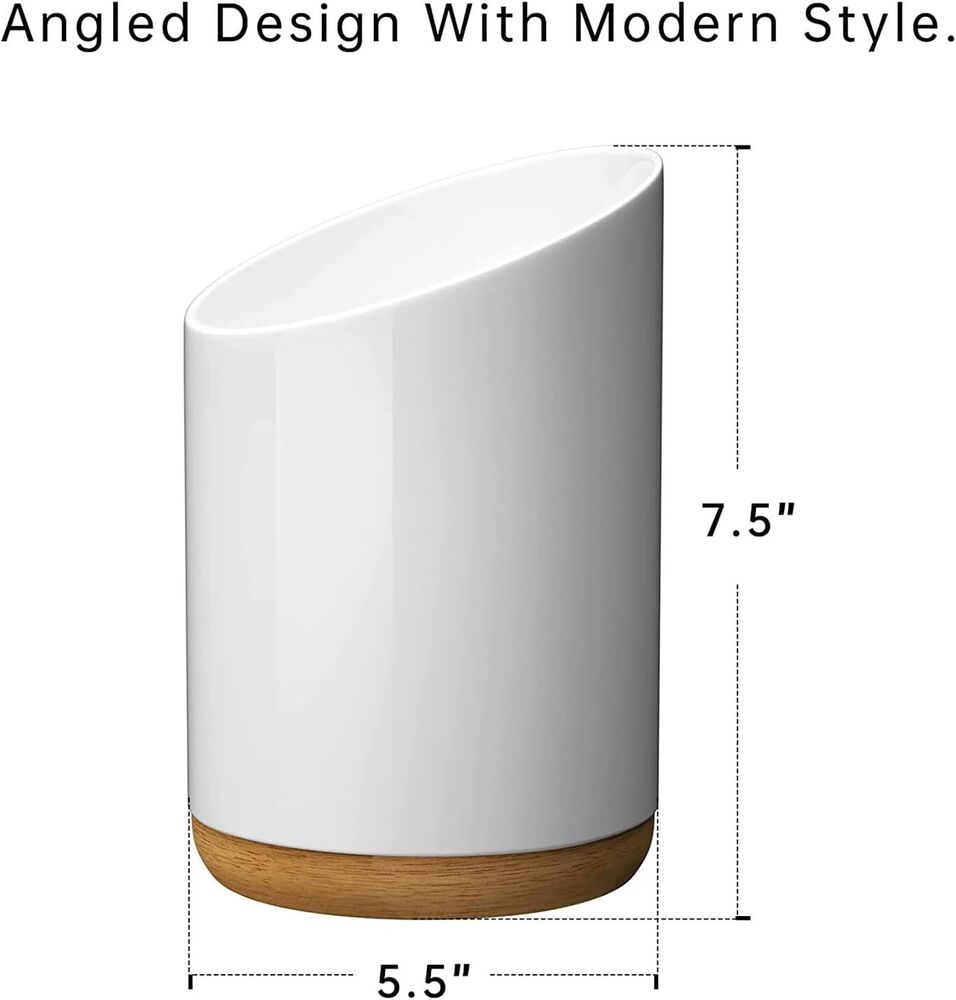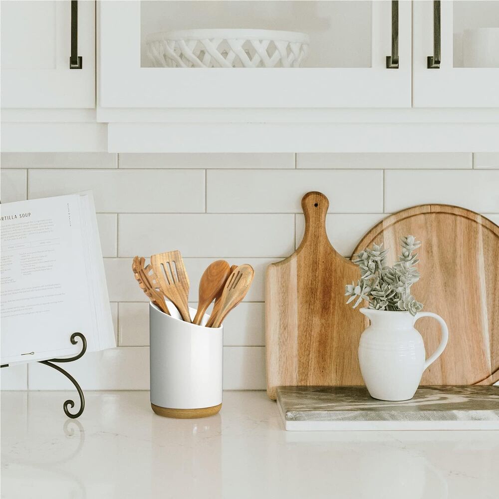 - Weighted wooden base: The sturdy acacia wood base of our ceramic utensil holder ensures that the utensil holder does not topple over even when completely full or almost empty. The base also protects your precious marble countertop from scratches and dings.