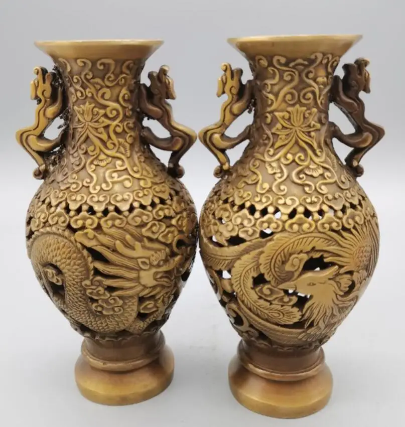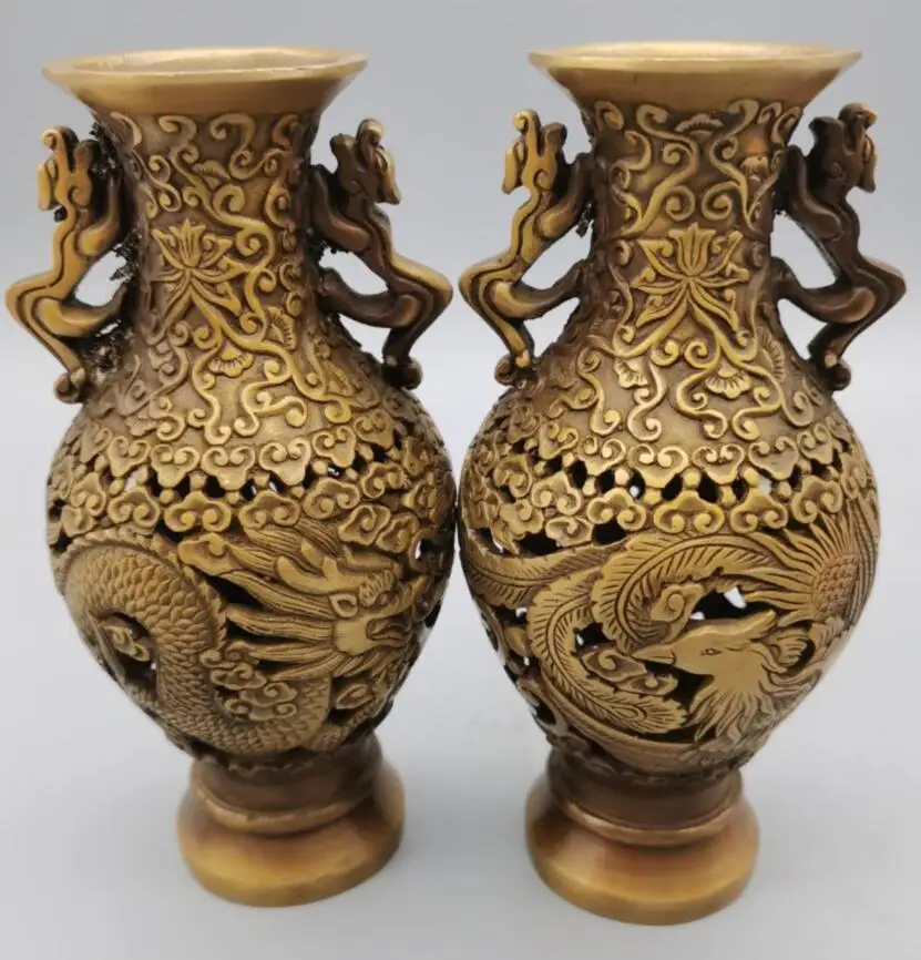 China brass Hollow out dragon phoenix vase crafts statue A pair