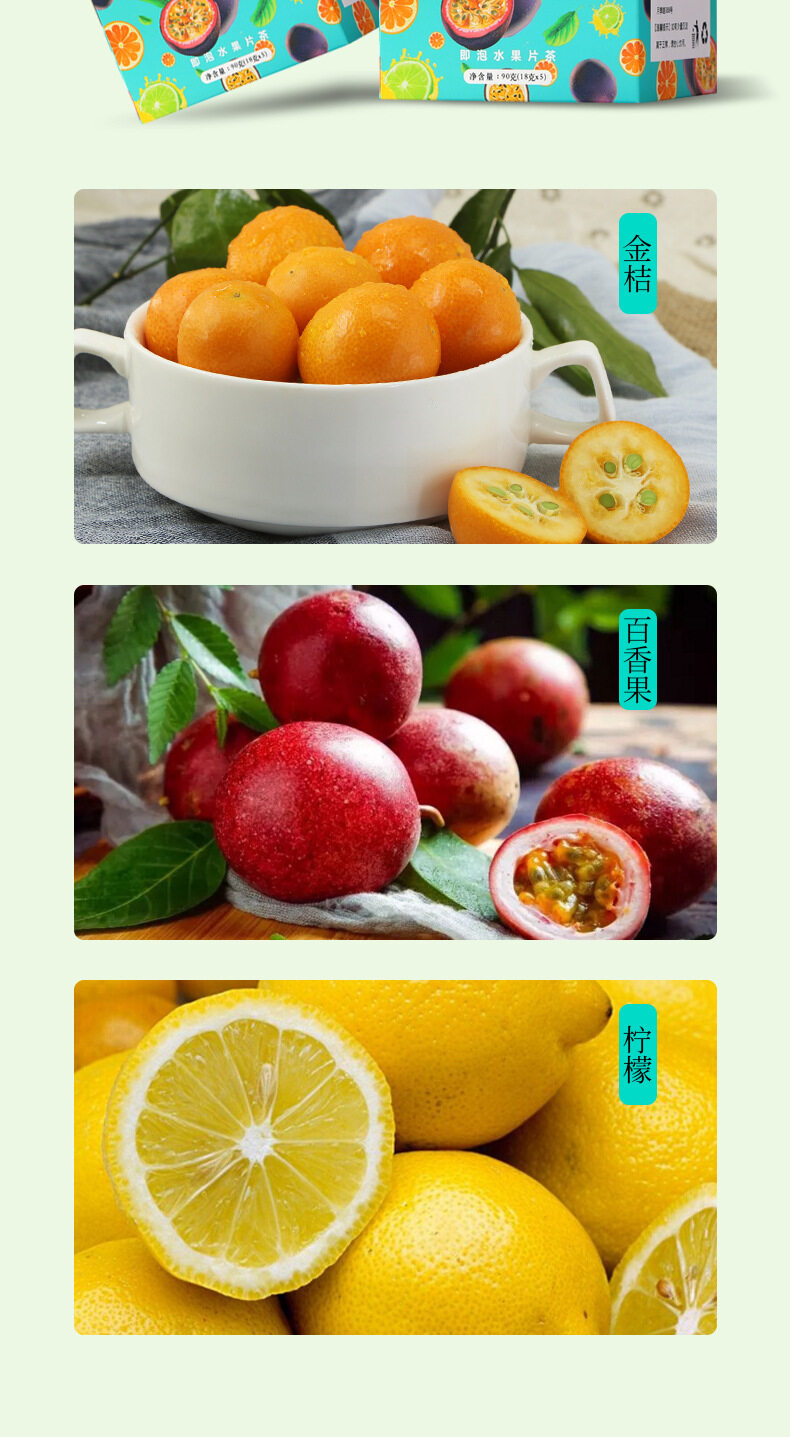 柠檬金桔百香果茶成分:柠檬干,金桔干,百香果干,冰糖功效:金桔,它还有抗炎、去痰、抗溃疡、助消食、降血压、增强心脏功能和理气止咳等功效,对支气管炎有较显著的疗效作用。柠檬是一种富含维生素的水果,含维生素C、维生素B1、B2等。维生素C能使皮肤变得光滑、细腻、白嫩、丰满,所以是一种理想的美颜美容食品。百香果的香气浓郁,甜酸可口,能生津止渴,促进代谢,提神醒脑,食用后能增进食欲,促进消化腺分泌,有助消化。精美盒装型适合送礼,送给爱的自己,送闺蜜,送爱人独立包装方便携带出门一盒18g*5包冲泡方式1. 拆开一小包2.加入60度以下温水3.闷泡3-5分钟即可饮用保存方式*低温,干燥,密封注意:糖尿病患者谨慎服用Lemon Kumquat Passion Fruit TeaIngredients: dried lemon, dried kumquat, dried passion fruit, rock sugarEfficacy:A glass of lemon passion fruit tea can give you sufficient Vitamin C to boost your day.Lemon and passion fruit are rich in vitamin C, which is an antioxidant that helps protect the body from damage caused by free radicals. We all know that antioxidants are good for our skin. Passion fruit has many types of antioxidants in it like Vitamin A, Vitamin C, riboflavin and carotene. These antioxidants reduce the production of free radicals in our body. Free radicals are generated by our body cells as a by-product and can cause skin aging.The exquisite boxed type is suitable for gifting, for the lover, For family, For friendIndividual packaging for easy carrying outOne box : 18g*5packsBrewing method1. Open a small package2. Add warm water below 60 degrees3. Stuffed for 3-5 minutes to withstandStorage method*Low temperature, dry, sealedPrecautions*The shelf life is 12 months*The date on the product packaging is the production date, not the deadline*Diabetics drink with caution