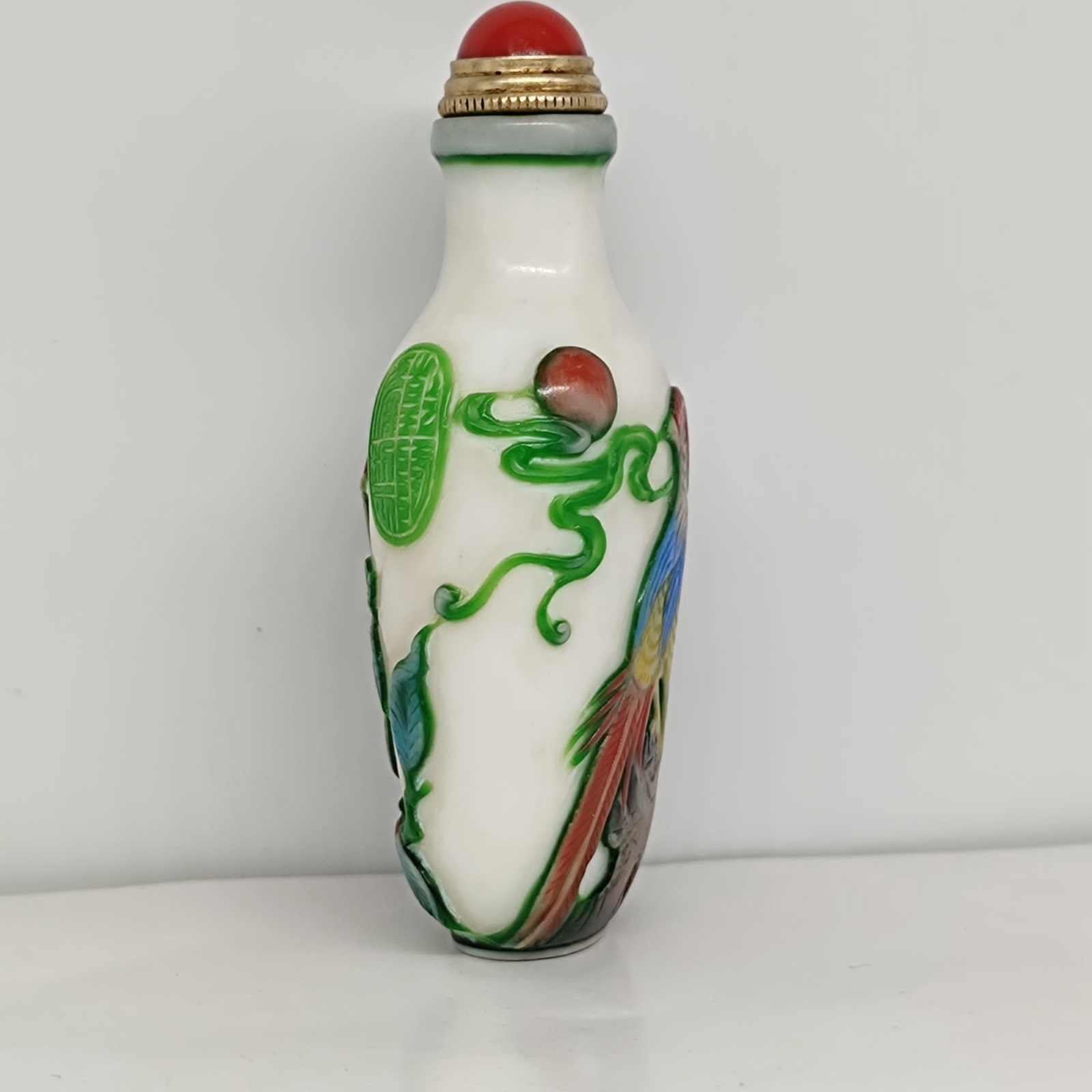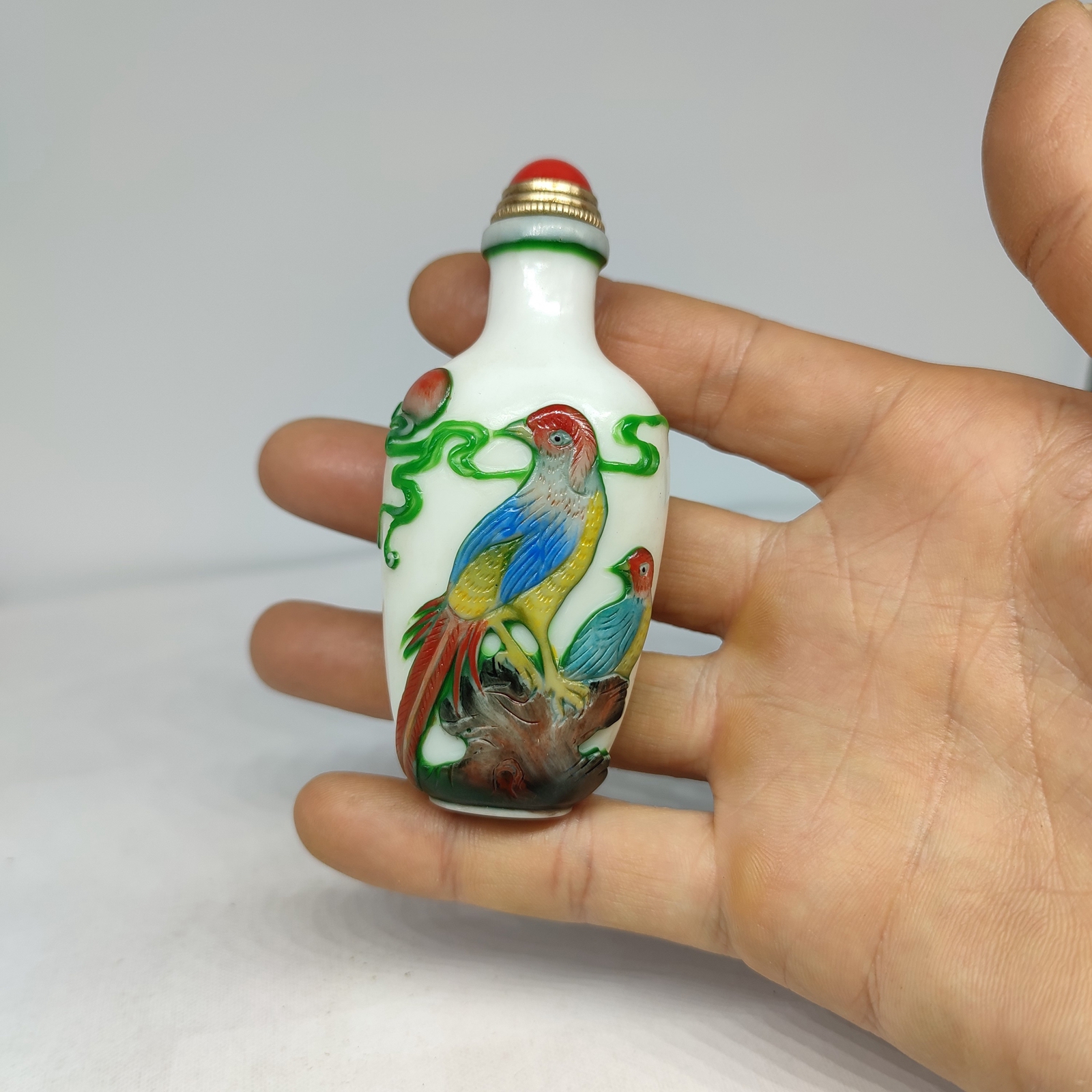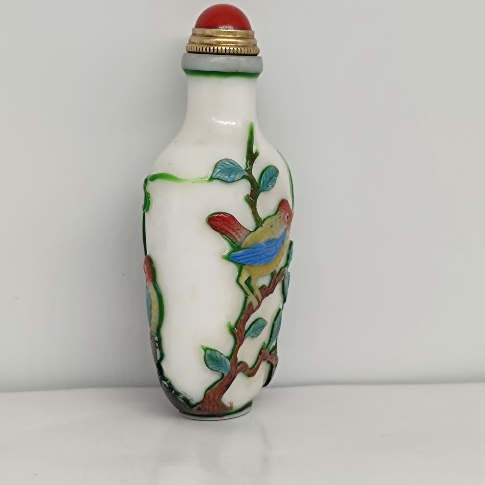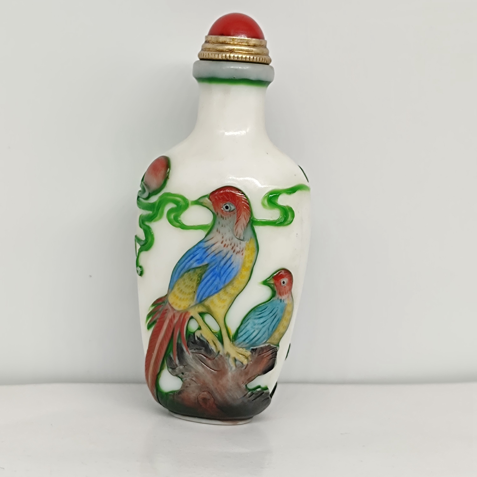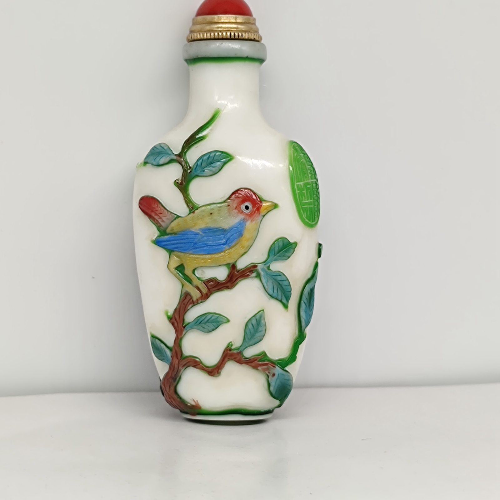 chinese carved tree bird statue peking glass snuff bottle painted Carving glaze