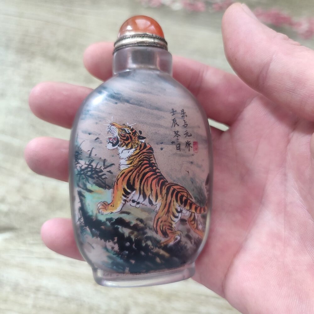 Chinese Glass Snuff Bottle Inside Painting Tiger Tigres Any The Twelve Animals
