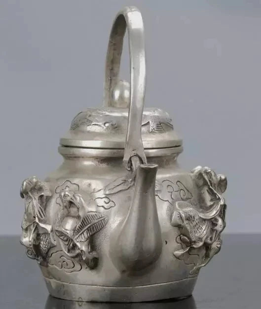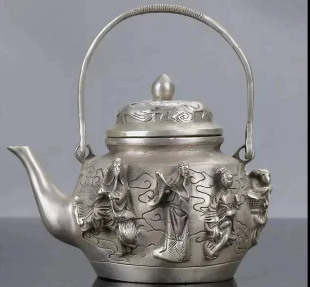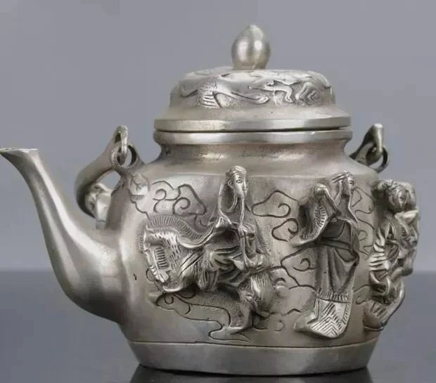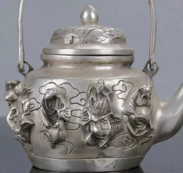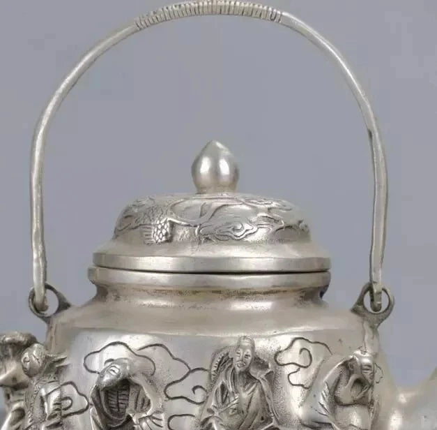 Chinese Silver Copper Handwork Carved The Eight Immortals Teapot