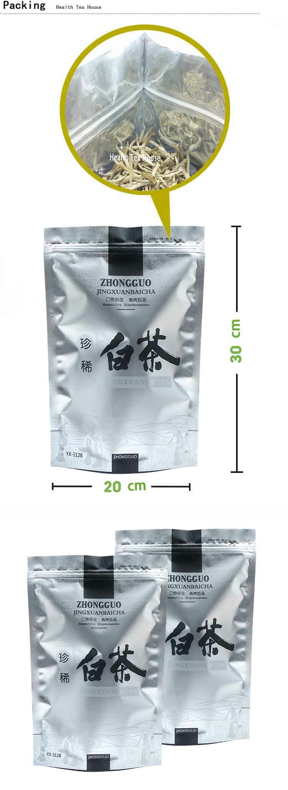 Silver needle White tea, created in 1796, is one of the six largest tea in China. Its origin is in Fujian. It is the title of the ten famous tea in China. It is known as "beauty" and "tea king" in tea. Its appearance is straight like needle, full of white, silver and snow. Because the fresh leaves are all tea buds, after the white tea needle is made into the finished tea, it looks like needle, white and dense, white and silver, so it is named "white needle silver needle". The six great health effects of silver needle white tea are nourishing the heart, nourishing the liver, nourishing the eyes, nourishing the mind, nourishing qi and nourishing the face. Besides, it also has the functions of radiation protection, relieving fatigue, clearing the heart, tranquilizing the mind, resisting aging, clearing away heat and reducing fire. Product attributes: Product name: Chinese Tea White Tea 250g Silver Needle White Tea Organic Bai Hao Yin Zhen Anti-old Packaging: Bag Total Weight: 250g / 500g / 1000g Packing list: 1 * Silver Needle White Tea The highest grade of the Bai Hao Yinzhen, fleshy, bright colored and covered with tiny white hairs. The shape is very uniform, with no stems or leaves. It was picked between March 15 and April 10 when it is not raining and only using undamaged and unopened buds. ******White tea has the most subtle flavor of all the teas, it is milder, contains less caffeine and thought to have the most antioxidant out of all the teas. Its refreshing and does not have an overwhelming tastes or scent compared to other teas. Only the youngest buds are selected for production of white tea, giving the tea the white-silvery hair on its buds. The difference between green and white tea is the production process where white tea does not go thru pan-frying, but instead allowed to wither. This tea is best prepared with below boiling water (at about 75 degrees Celsius) and produces a slightly viscous glittering pale yellow color with evidence of floating white hairs that reflect light. The flavor and fragrance is be delicate, light, fresh, and slightly sweet. Steeping is for slightly longer than other white teas, up to 5 minutes. The taste of King grade is very mild.